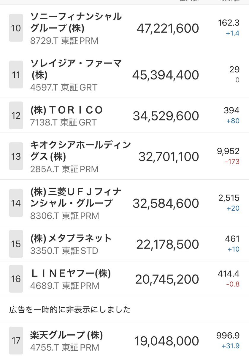 TORICO。今日もストップ高! 値上がりランキングは2位、そして出来高が錚々たるメンバーに挟まれて、メタプラネットや三菱UFJ、LINEヤフーに勝ちました!🎉🎉㊗️ 皆さんのご期待に応えれるよう頑張ります😊 「イーサリアムといえば、TORICO!」