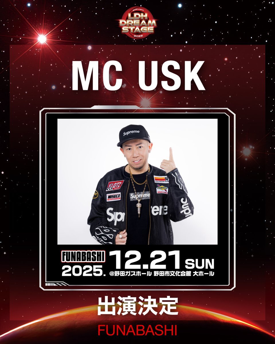 🔥スペシャルMC決定🔥 12/21に開催する「#EXPG Presents LDH DREAM STAGE」 FUNABASHI公演に”MC USK”がスペシャルMCとして登場!! 軽快なMCでFUNABASHI公演に勢いをプラスします🎙✨ ぜひ会場にお越しください!! 🔽詳細 e-ticketbook.com/expg-dreamstag… #LDHDREAMSTAGE #ドリステ #発表会 #ダンス #ボーカル pic.x.com/2JEYuAd1yB