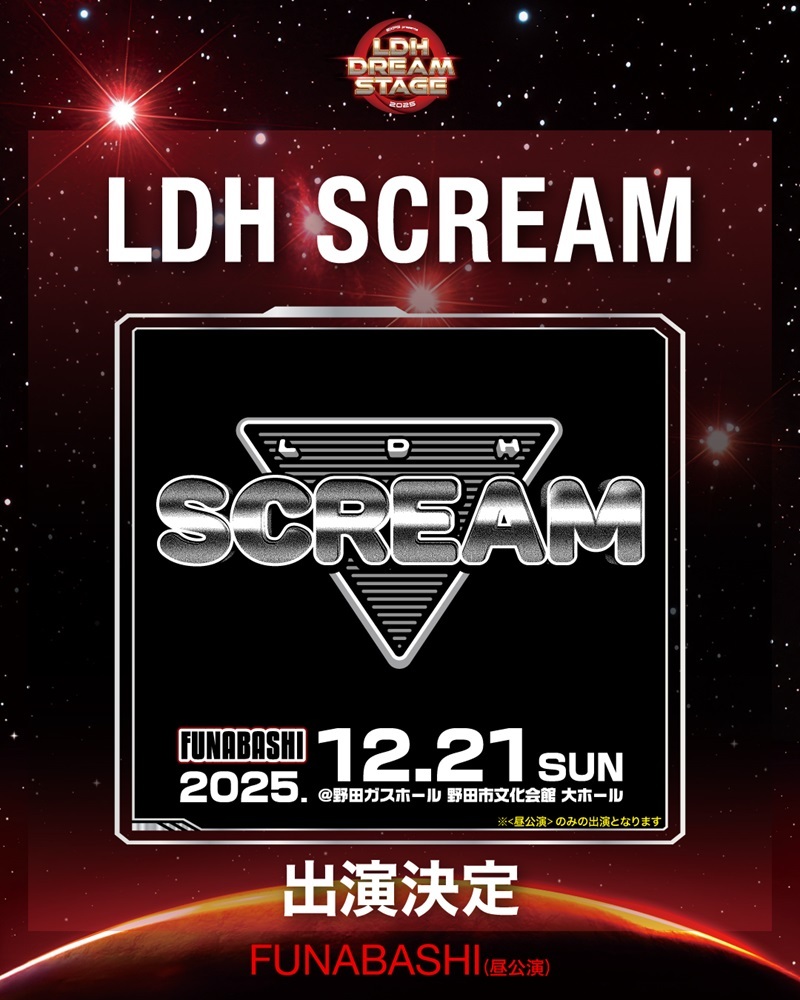 [📣]𝙀𝙑𝙀𝙉𝙏 𝙄𝙉𝙁𝙊𝙍𝙈𝘼𝙏𝙄𝙊𝙉 #EXPG presents "LDH DREAM STAGE" FUNABASHI 昼公演に #LDHSCREAM が出演!! ------- 🗓️12/21(日)12:30 📍野田ガスホール 野田市文化会館 大ホール 🎫e-ticketbook.com/expg-dreamstag… 精一杯パフォーマンスいたします🔥 よろしくお願いします📣 @expg_studio pic.x.com/YkkQmpdWMZ