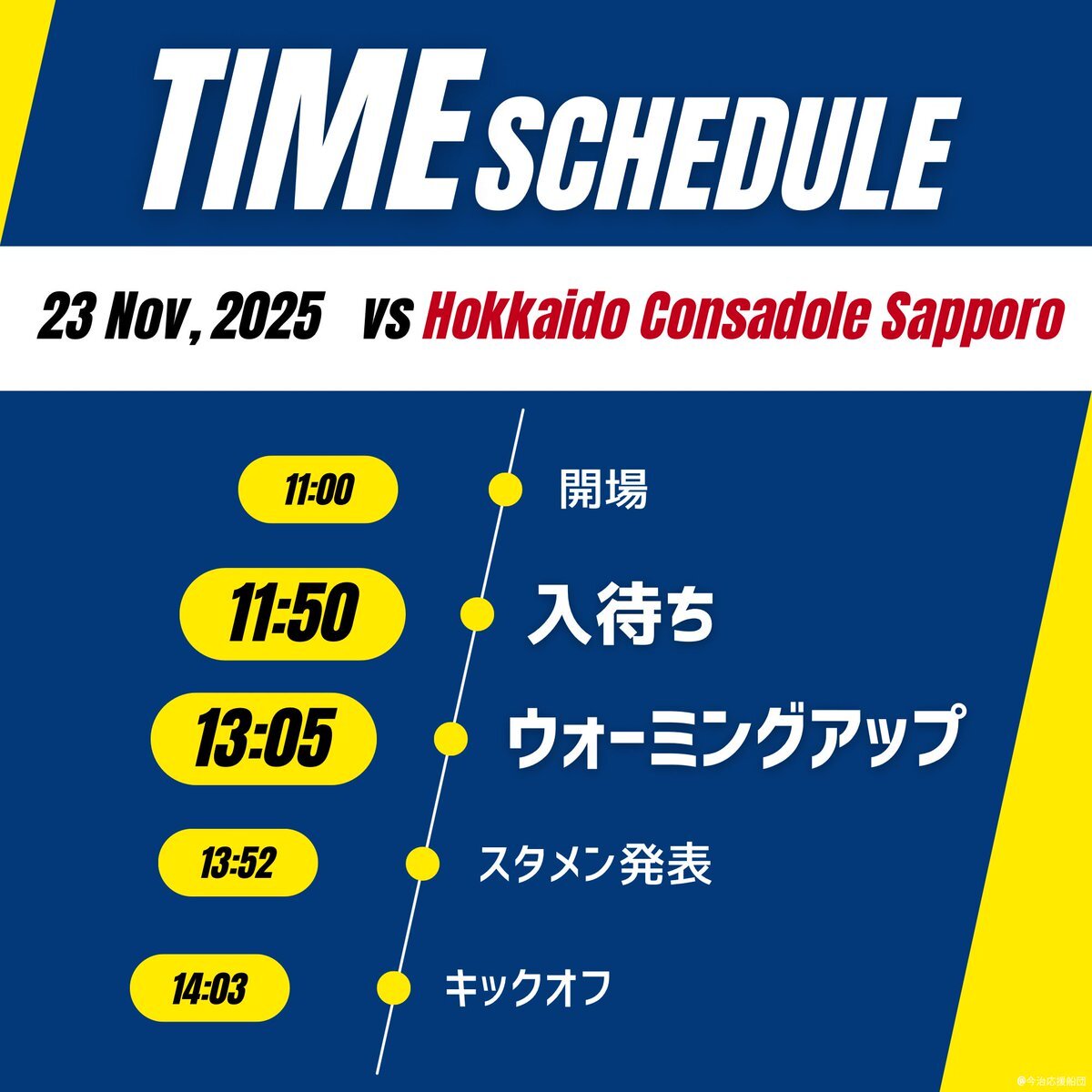 【タイムスケジュール】 11:50〜 入待ち 13:05〜 ウォーミングアップ 今シーズン最後のホーム戦となりました! シーズンを通して闘ってきた選手たちへ、ホームだからこそできる大人数での入待ち、ウォーミングアップ時の応援で熱い想いを届けましょう! ホーム最終節、絶対に勝ちましょう! #FC今治