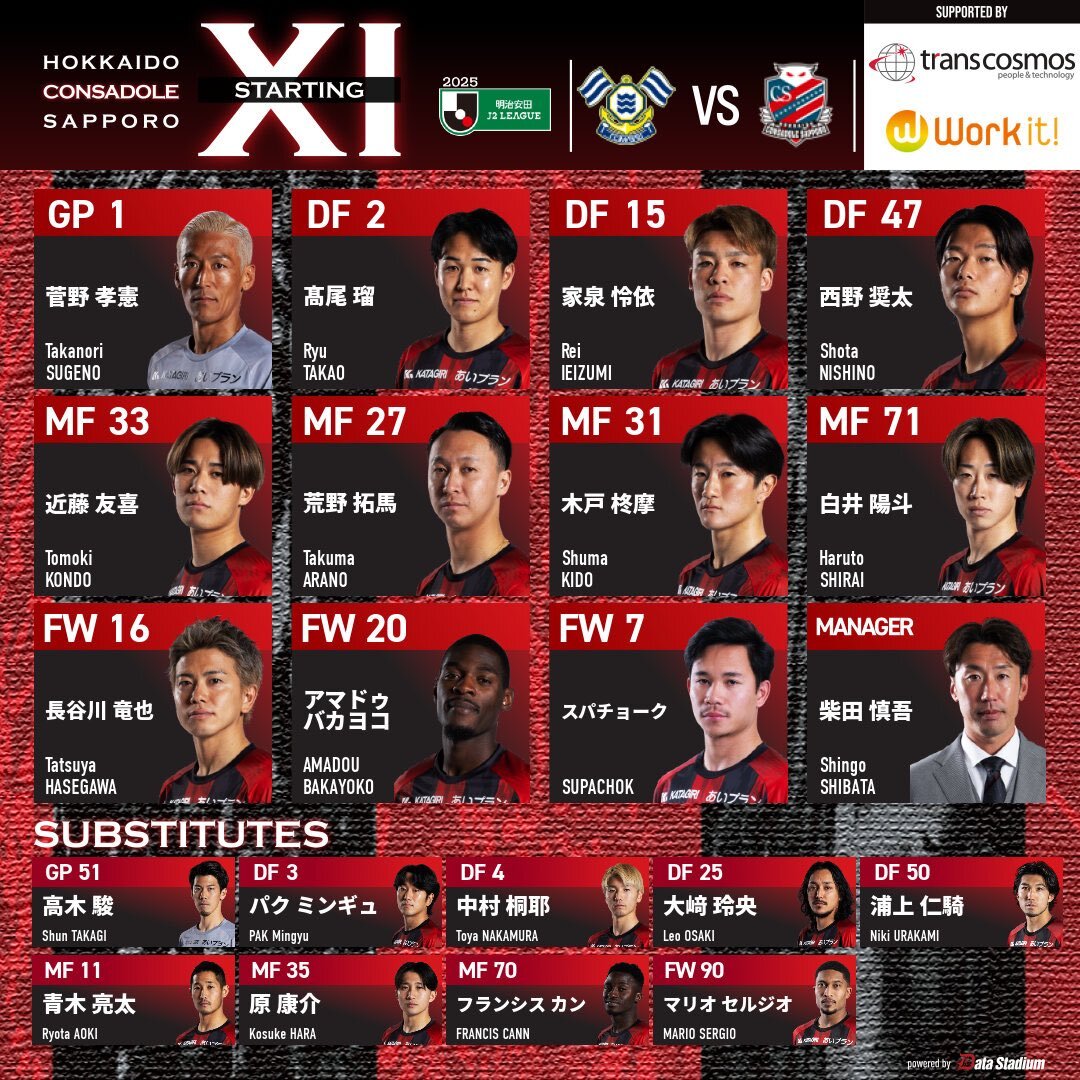 🔺STARTING XI🔺 🏆明治安田J2リーグ 第37節 🆚#FC今治 🗓 11/23(日) 14:00KICKOFF 🏟#アシックス里山スタジアム #consadole #コンサドーレ #試合も働きごこちも全力応援トランスコスモス #DAZN の加入・視聴が強化につながる📺 →consadole-sapporo.jp/lp/dazn/ #スポーツくじWINNER がクラブ強化に🎉 pic.x.com/AW3kb7qoh0