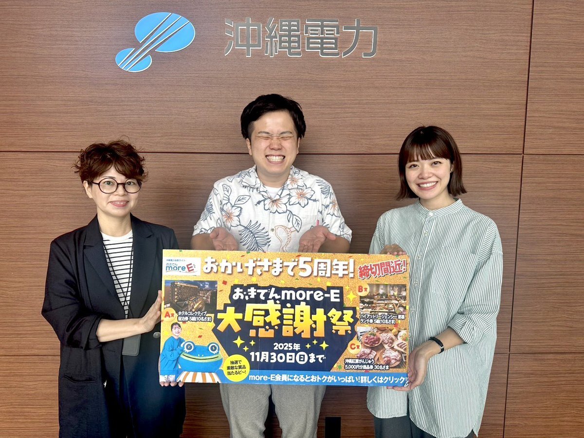 朝のラジオカーは 沖縄電力 へ🎤 『沖電more-E』が5周年🎉 これを記念した「more-E大感謝祭」11/30(日)まで開催中❗️ 新規登録または ログインするだけで応募完了! 素敵な賞品が当たりますよ🎶 ぜひご参加ください🎁 詳しくはモーニングウォッチで📻 radiko.jp/share/?t=20251… #fine873 #FM沖縄 pic.x.com/XfvMybBZZw