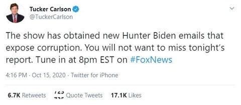 Q4877 ハンター・バイデンの腐敗を FoxNewsでオン・エアー? 2020年10月15日 qajf-qmapjapan-pub.officialblog.jp/archives/76247… (@TuckerCarlson のTweet) 番組は、ハンター・バイデンの腐敗に関する新しいEメールを入手しました。 お見逃しなく。#FoxNews で東部標準時 午後8時より オン・エアー (2020/10/15) >>11090349 pic.x.com/XLq9L0XSv6