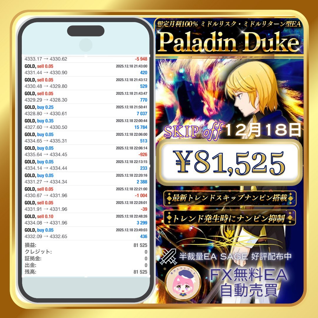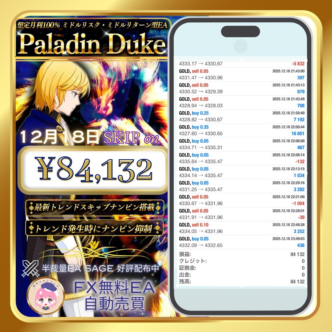 GOLD専用EA🗡️Paladin 12月18日結果 ⚜️⚜️⚜️ 🛡️Paladin Duke +81,525円 日利8.2% 🛡️Paladin Duke +84,132円 日利8.4% ⚜️⚜️⚜️ 🔽無料配布 lin.ee/Kpohw9R 🔽「FX無料EA Saga」 x.gd/hNz1N #FX自動売買 #ad pic.x.com/Z5t8wRv7v0