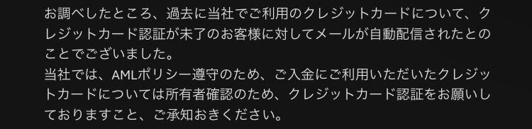 、、、とのこと。 勘違いってことでいいのか?未認証で残しておいたつもりはないけど、クレカ入金自体を年単位でしてないから記憶ががが。 チケットは一旦閉じて、念のため過去に使ってたクレカの番号を調べられる範囲で確認しておくか。 #FXGT pic.x.com/G2lXPjvRxR