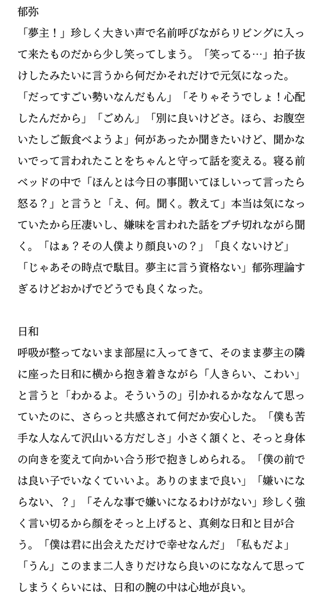 「昨日郁弥と喧嘩したんだけど」って彼女に愚痴って経緯を話せば「それは夏也くんが悪いよ」「お前必ず郁弥の肩持つよな」「だって毎回夏也くんに非があるんだから仕方ないじゃん」ぐうの音も出ず黙ってると「謝ったら?」と促されれば、素直に郁弥に謝ろうと思えるから不思議だけど有難い #Freeプラス