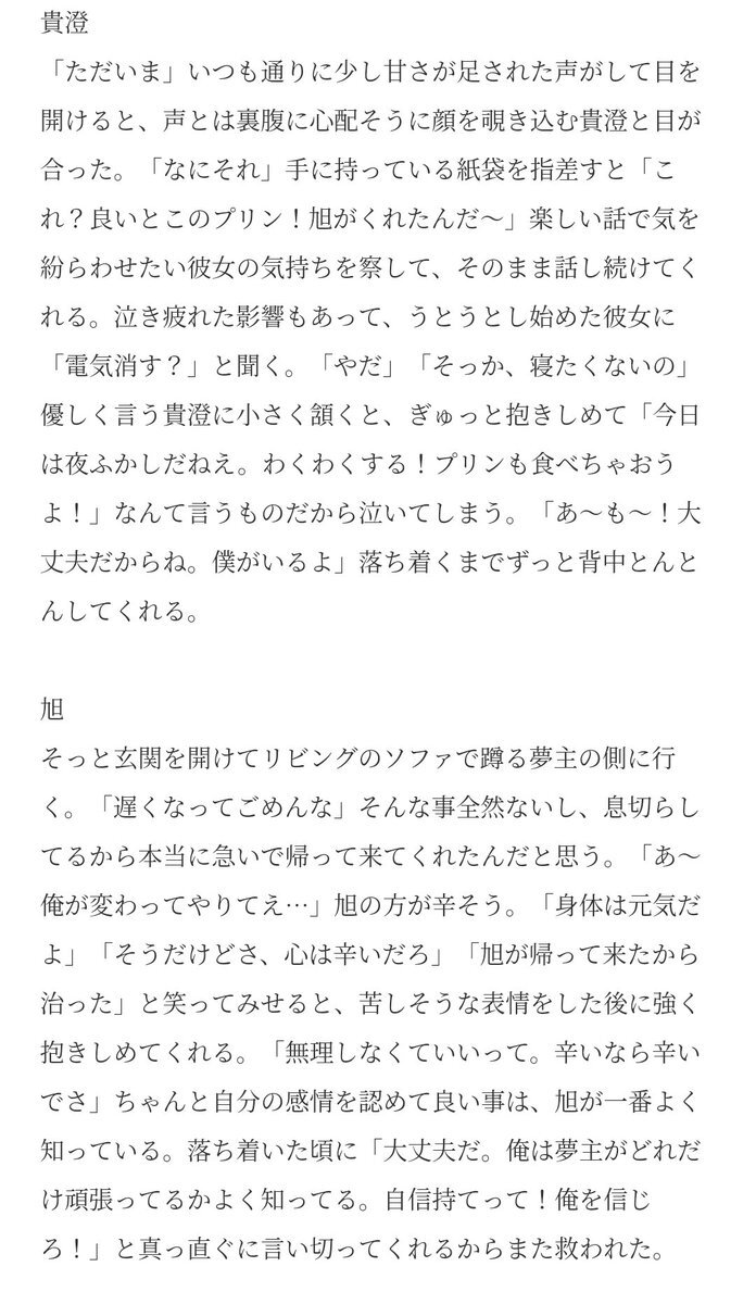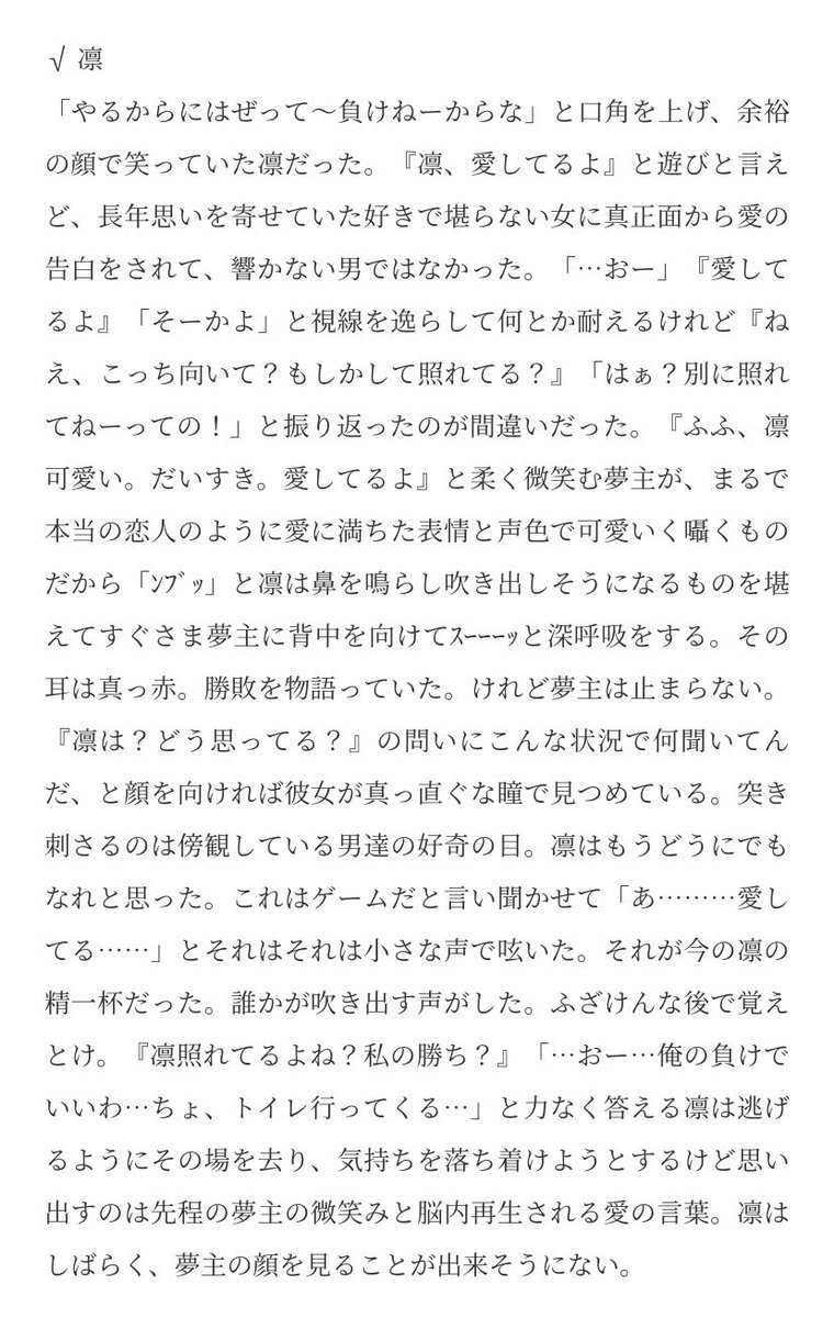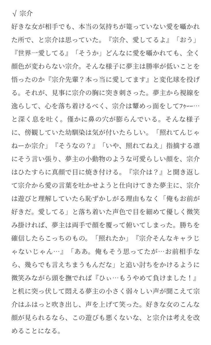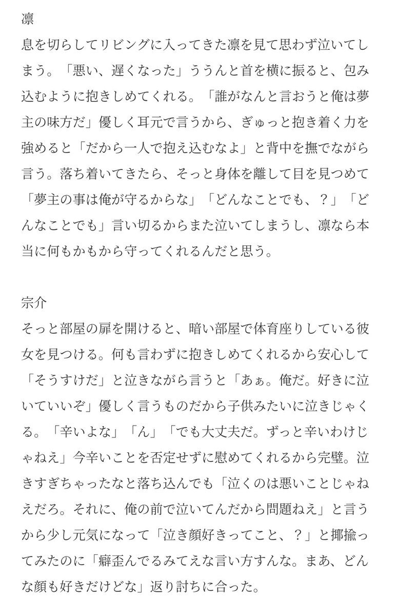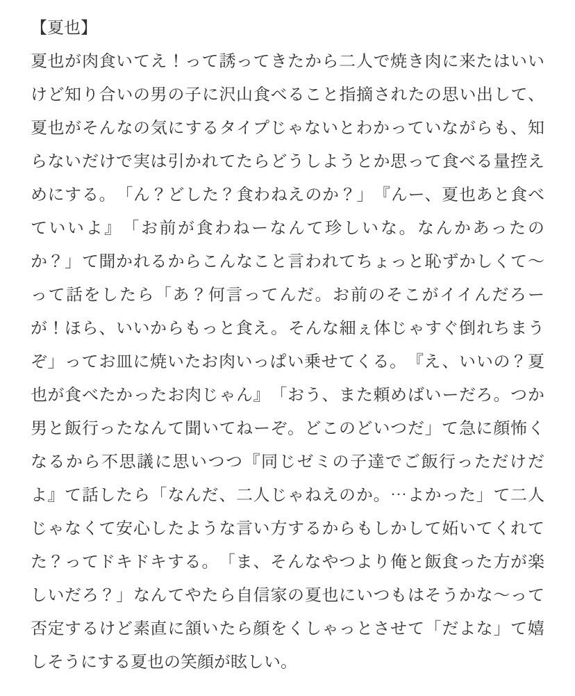 #freeプラス 彼女に対して滅多に怒らない優しいmktは彼女が心配で注意したことくらいは数回あるけど、自身が感情的になって怒ったことは全くないと思っているんですが、仲間内での飲み会で彼女が酔ってしまい、仲間内だからという安心と信頼故に距離近くなるから「(顔近いよ夢主…!)」と思っては