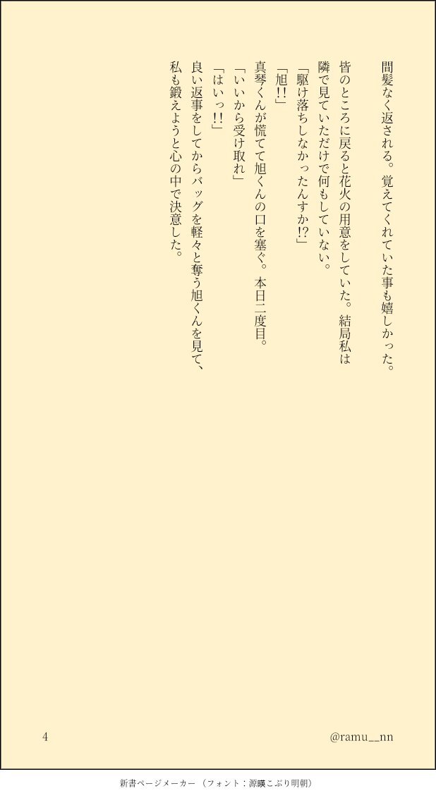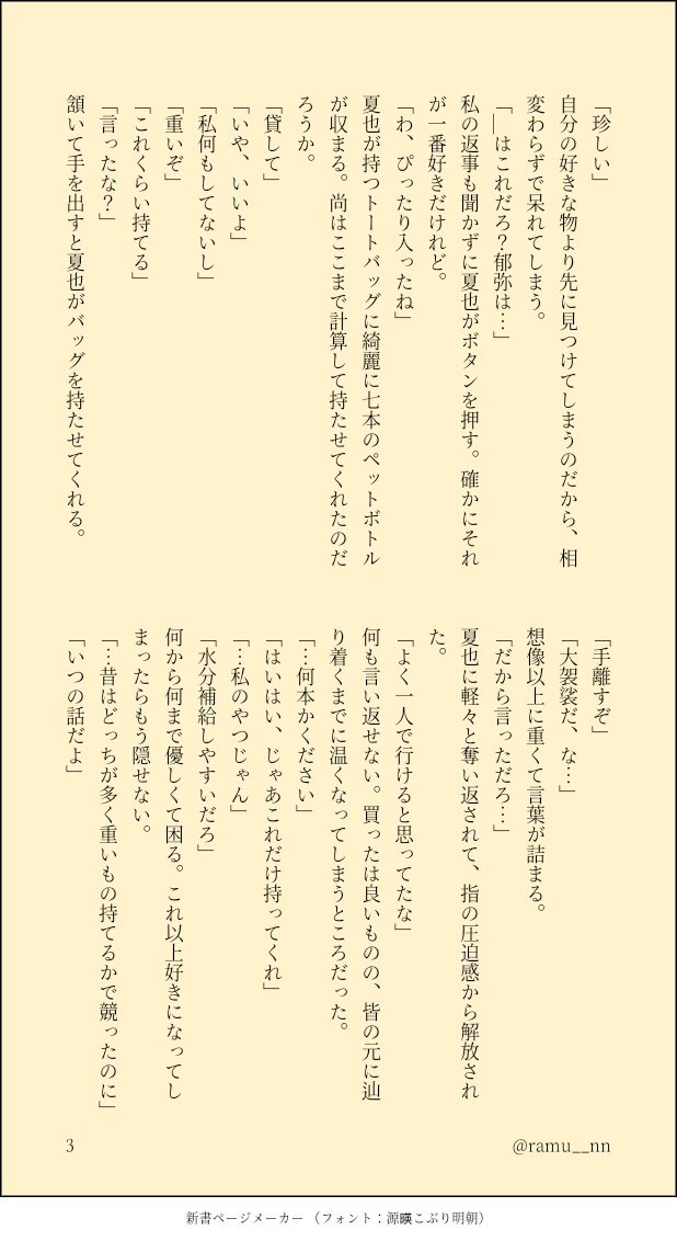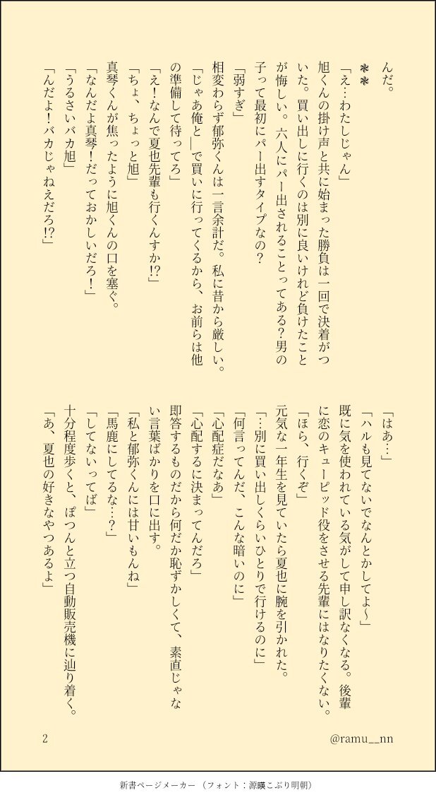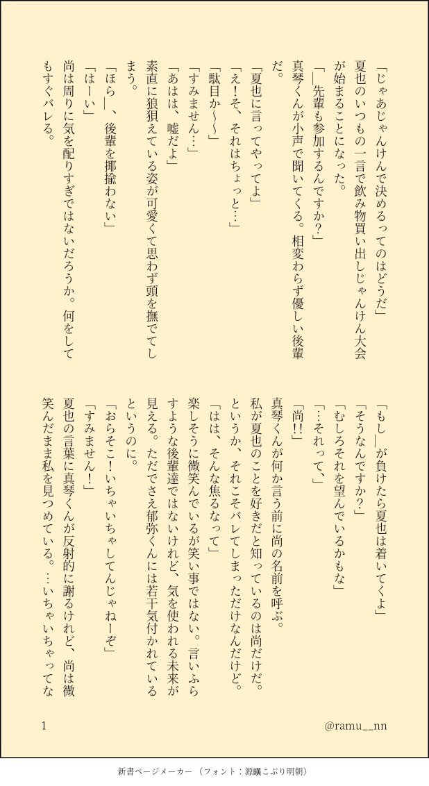 彼女が唐突に「夏也くん、写真集とか出さないの?」って言い出すから思わず吹き出しながら「出ねえし、誰が買うんだよ」「とりあえず私は買うし、私のお母さんも買うと思う」だいぶ真面目な顔で返してくるから声をあげて笑って「俺もお前の写真集欲しいかも」「需要ないし」「俺は買う!」#Freeプラス