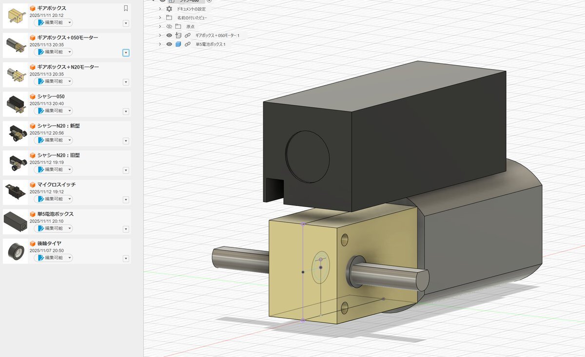 今日の進捗。 届いたN20モーターが1.5vだと050モーターより弱過ぎなので、やはり050と並行して作ってみて実走で比べる事にした。 あと電池ボックスはモーターの上に配置しようか検討中。 #fusion360 #トミカサイズミニ四駆 #ミニミニ四駆 #ハーフミニ四駆 pic.x.com/BAmrW5GQB1