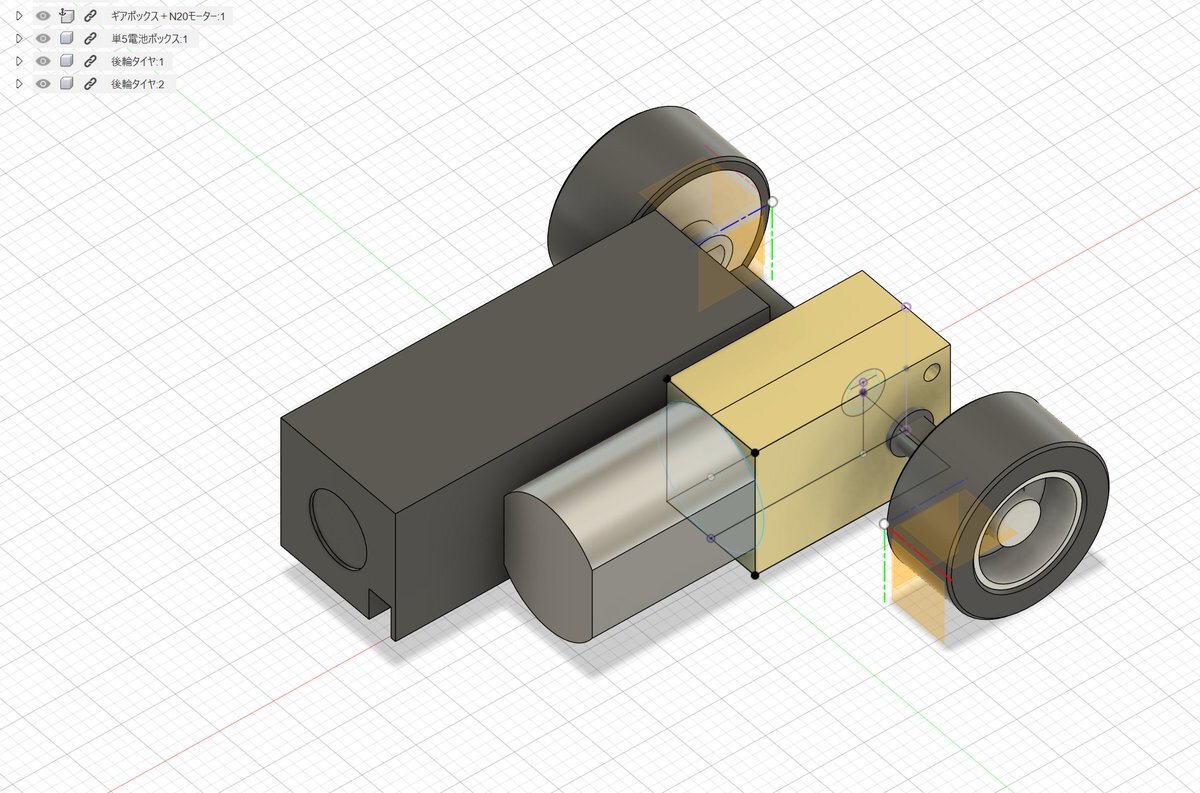 今日の進捗。 後輪タイヤ + 単5電池ボックス + ギアドN20モーター 050モーターが単5電池1本でもけっこうなトルクで回転する事が解かったので、電池は1本で行く事に。 来週N20モーターが届くから、そっちのトルク次第では050じゃなくN20で進めよう #fusion360 #トミカサイズ自作ミニ四駆 pic.x.com/bDBKx2frYp