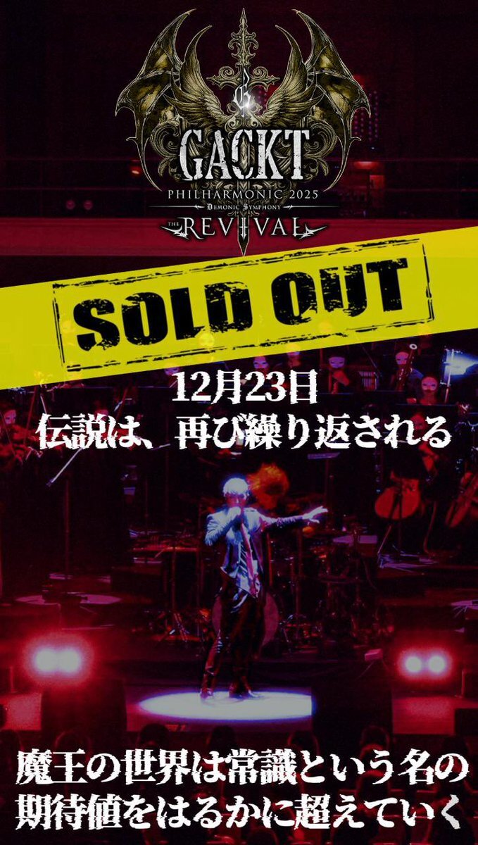 🔥チケット完全SOLD OUT 🔥 12月23日開催 GACKT PHILHARMONIC 2025 魔王シンフォニー THE REVIVAL ⚠️本公演は、全席完売につき、当日券の販売はございません。 #GACKT #魔王シンフォニー #グランドフィル @GACKT_GL_ONLINE @GACKT_Secretary pic.x.com/oiR2Pynmf9