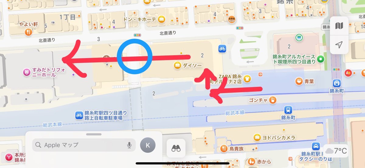 さて、来週23日東京は雨予報です☔ なるべく濡れない経路はこちら 錦糸町駅改札を出たら、 外に出ずに建物内を左折、 突き当たりを右に行くとすぐ外 ですが、すぐアルカキットというビルに入り、 2階から連絡通路へ 🔵部分だけ傘を差したらもうすぐそこ! #GACKT #魔王シンフォニー #PHILHARMONIC