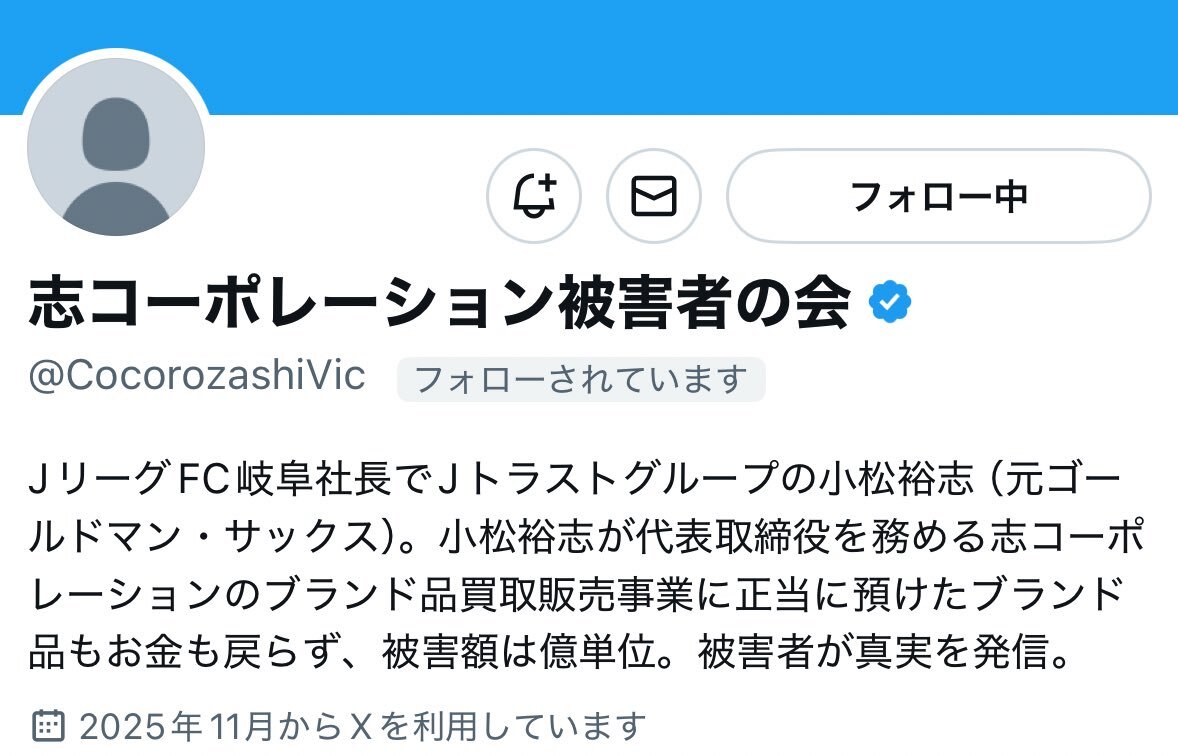 FC岐阜の小松社長、これだけ騒ぎになっても誰一人として預けたブランド品返ってこないからもう全部売っちゃったのかもな。 被害者14名で預けた1.5億円分が行方不明 被害者の会はこちら👉 @CocorozashiVic