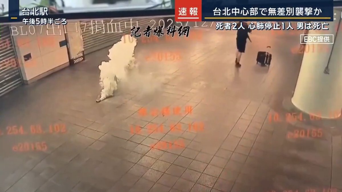 【速報】台湾中心部で無差別襲撃か | 台湾・台北市内にある台北駅構内で、男が発煙筒を投げながら隣の中山駅へ移動。その後刃物を取り出して通行人を次々と襲撃した 8人が負傷、うち2人が死亡し1人が心肺停止 →現地メディアによると、亡くなったのは犯行を止めようとした57歳の男性