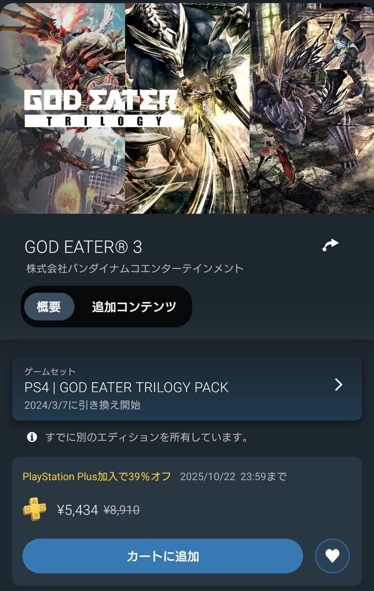 #godeater 10/22までの2週間、PSplusに加入するとゴッドイーター トリロジーパックが39%オフの¥5434でまとめ買い出来ちゃいます! 前までは33%オフの¥5969だったので何気にもっとお安くなってます!(重要) 1作あたりの単価が¥1811ですよ!? 復帰勢、新規勢、現行勢、皆で神を喰らいませんか? pic.x.com/6Q5PyT8OfU