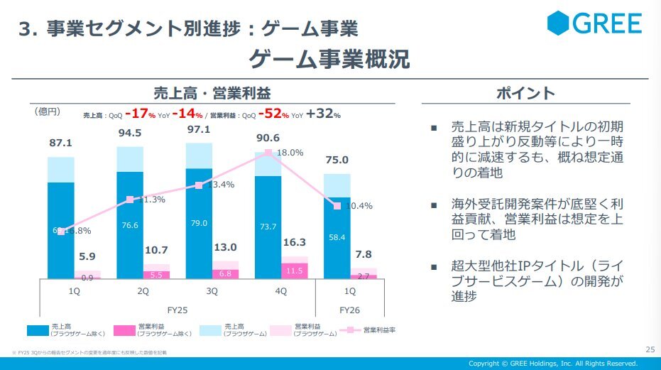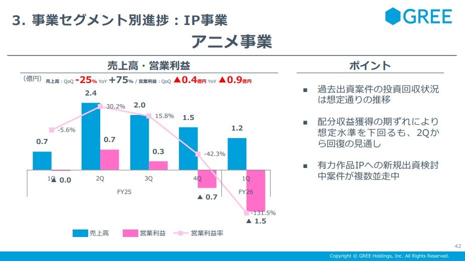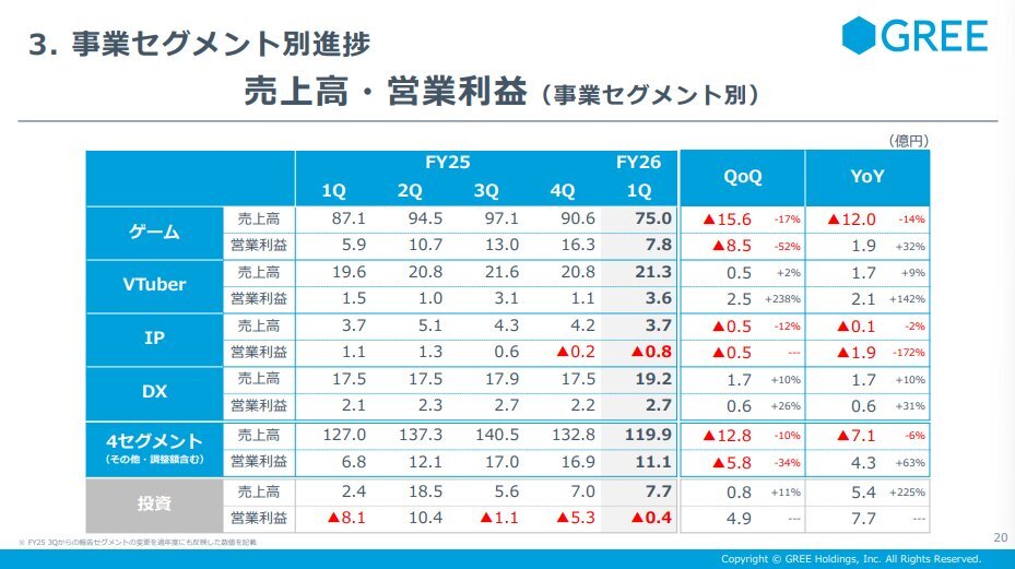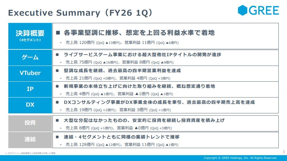 【3632 #GREE】1Q決算 #エンタメ決算 売上:127億6500万円(YoY▲1.4%) 営利:10億6800万円(黒字転換) 企業: ゲーム/VTuber/IP/DX/投資を展開する総合ネット企業 今期: 各事業堅調。ゲームは既存タイトル減収も黒字、VTuberは過去最高益。IPは新規投資継続、DXは過去最高売上 hd.gree.net/jp/ja/ pic.x.com/cSq2vzhq6z