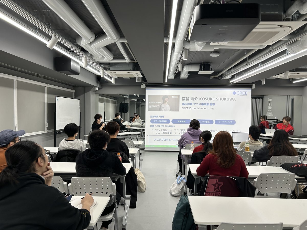 今日はGREEのアニメ事業部・宿輪浩介氏が来校され、特別授業を開催しました🎉人気アニメ作品を手掛けた背景や、今学ぶべきことなど超充実の90分😍 クリエイターが心にとめるべき言葉が散りばめられた授業に、たくさんの生徒・学生が夢中で聞いていました! 宿輪先生ありがとうございました!! #GREE pic.x.com/yoUbRd5AUC