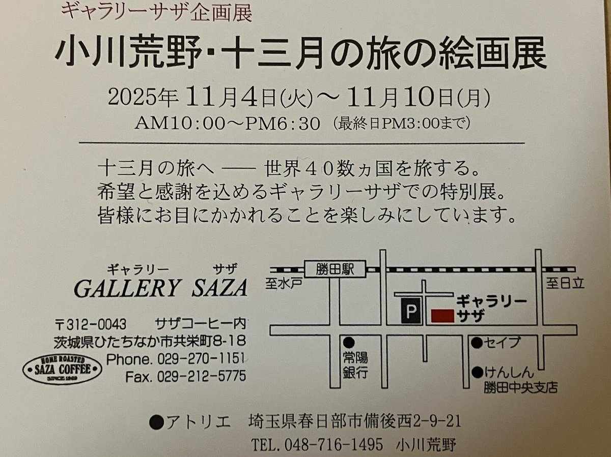 ギャラリーサザ企画展 小川荒野・十三月の旅の絵画展 2025年11月4日(火)〜11月10日(月) AM10:00〜PM6:30(最終日PM3:00まで) ギャラリーサザ GALLERY SAZA サザコーヒー内 #ギャラリー#ギャラリーサザ#企画展#絵画展#小川荒野#十三月の旅の絵画展#gallery #GALLERY #サザコーヒー#茨城県 pic.x.com/KSsci8aXzJ