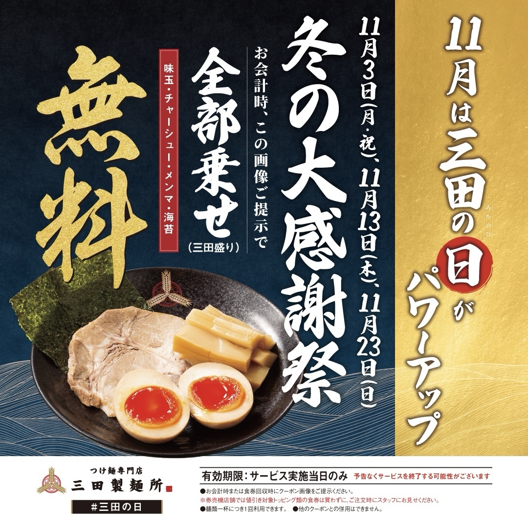 11月は三田の日パワーアップ! 【11月は3日・13日・23日が #三田の日 】 こちらの画像ご提示で、全部乗せトッピング「全部乗せ」をお一つ値引きいたします! お会計時にスマートフォンなどでクーポン画像をご提示下さい📷✨ #三田製麺所 #冬の大感謝祭