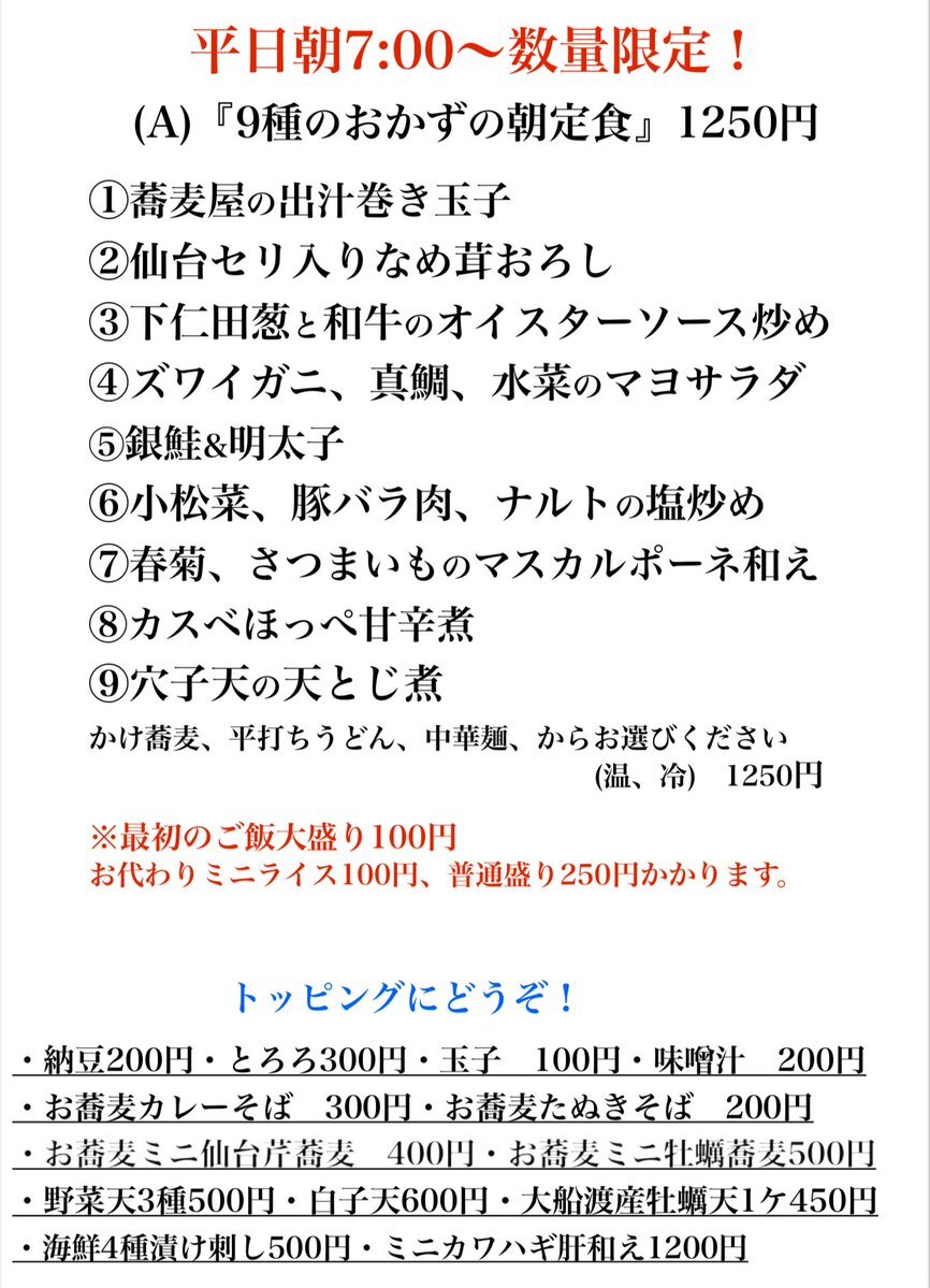 明日火曜日の朝限定メニューは! こちらの『9種のおかずの朝定食』1250円です! 明日も中華麺ございます! 明日は中華麺もございます! おそば、うどん、中華麺からお選びくださいね🍜