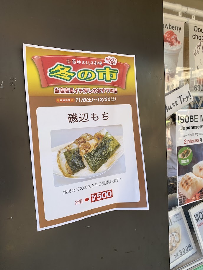 ☝️店長一推し!📣 築地おもしろ市場の名物「磯部もち」😋 風味豊かな海苔と、とろけるお餅の最強タッグ✨ 焼きたてアツアツをその場でどうぞ🔥 2個で500円はお得❗️ #磯部もち #築地 #つきじgo