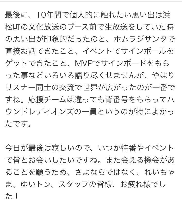 最後までホムラジらしい放送で、私も笑顔のままで見続ける事が出来ました。いつか復活してくれることを願っています。長い間、素敵な番組を届けてくださり、本当にありがとうございました。 #HRr #ホムラジ