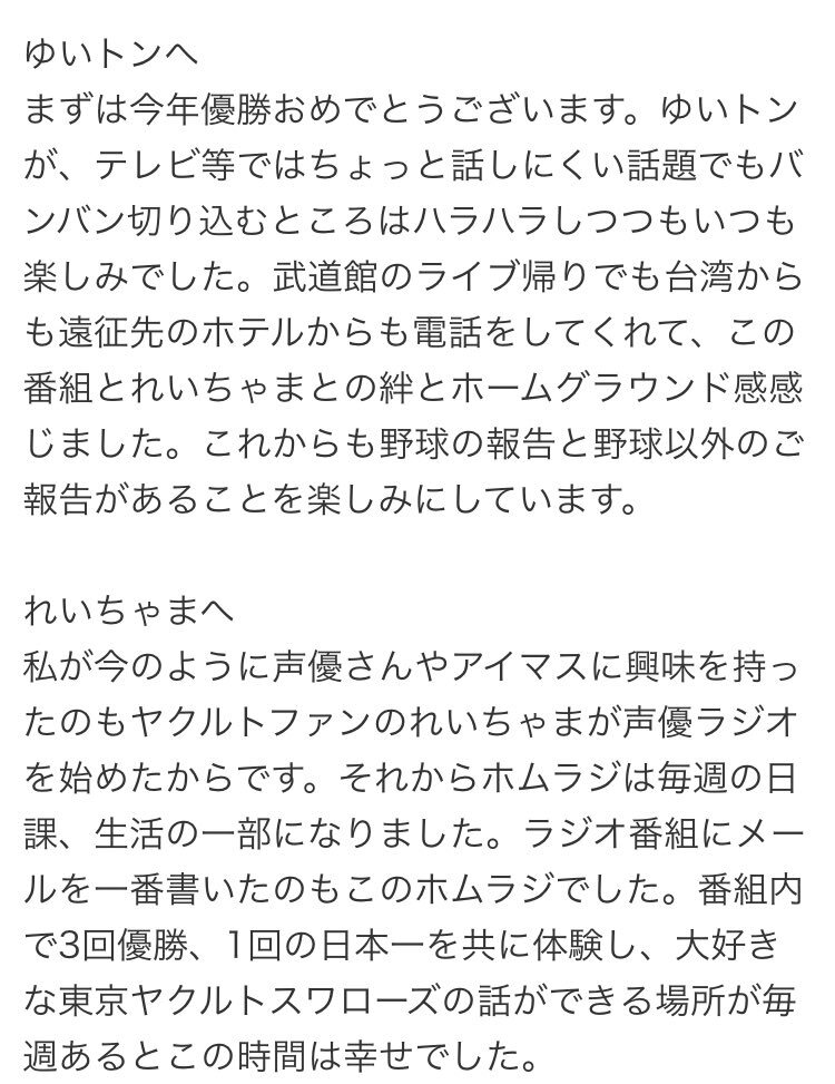 初期のゲスト回で高橋美佳子が語っていたように、女子も野球を語りたい、という意外に重いジェンダー的課題に向き合って、時には女子の煽り合いまでそのまま流したという点でも特殊な女性声優ラジオだったけれど、放送局変更も乗り越えて生放送を続けて10年半は結構凄い通算記録。 #HRr #ホムラジ