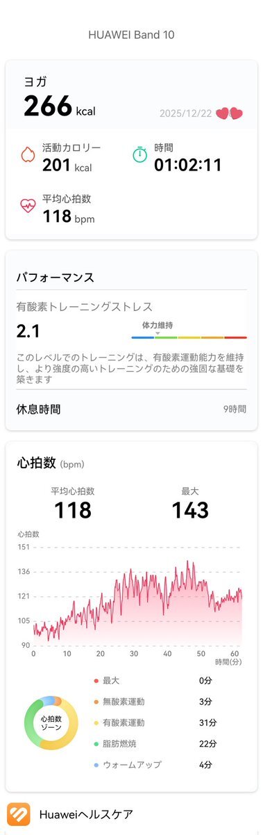 2025/12/22 Wt.+5.0kg #開脚フローヨガ #ホットヨガLAVA 266kcal #Huawei #Band10 MAX 143bpm AVE.118bpm ヨガビギも美腸力もピンと来ず悶々🤔→💅🏻手直しが10分ちょいで🔚→3分後には🚃→6分前にCheck-in✨️ 滑り込み🙆🏻♀️ 初のIR、何か不思議な間を取る人だった…合わない?? #ホットヨガ #lava #ヨガ pic.x.com/iK7A31zYDv