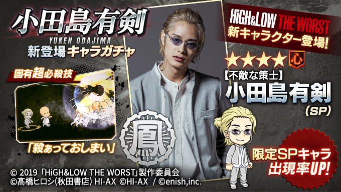 #THEWORST 新キャラガチャ開始🔥 ☆4SP【不敵な策士】#小田島有剣 鳳仙四天王の一人・小田島が登場‼ 武闘派ぞろいの鳳仙学園のなかでも冷静な策士と言われる存在👀 ゲットのチャンスをお見逃しなく🤩📢 #ハイローゲーム #HiGH_LOW_THE_WORST #HiGH_LOW #塩野瑛久 pic.x.com/8sSfouQxoJ
