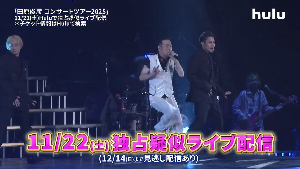 22日擬似ライブ配信後も見逃し配信を 視聴させていただいています #田原俊彦 のこれまでの軌跡が詰まった 構成セットリスト…往年のヒット曲に加え 毎年新曲リリースで進化を魅せ続ける #トシちゃん は、やはりショーマン🕺✨ #Hulu さんで12月14日いっぱいまで 視聴できます! 必見です!是非っ! x.com/hulu_japan/sta…