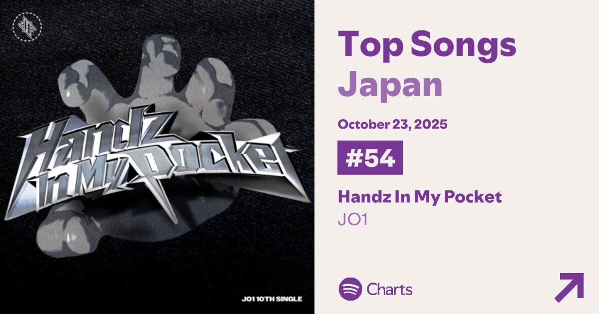 / 🚨今日だけでなく、明日明後日とスミン強化を! \ 🟢Spotify Daily Top Songs Japan 10/23(木)付 54位🔻(↓1) 𝐇𝐚𝐧𝐝𝐳 𝐈𝐧 𝐌𝐲 𝐏𝐨𝐜𝐤𝐞𝐭 ▫️再生数 103,075回 (前日−2,282) ▫️チャートイン回数 28回 ▪️50位は121,375回(50位との差は18,300回) #JO1