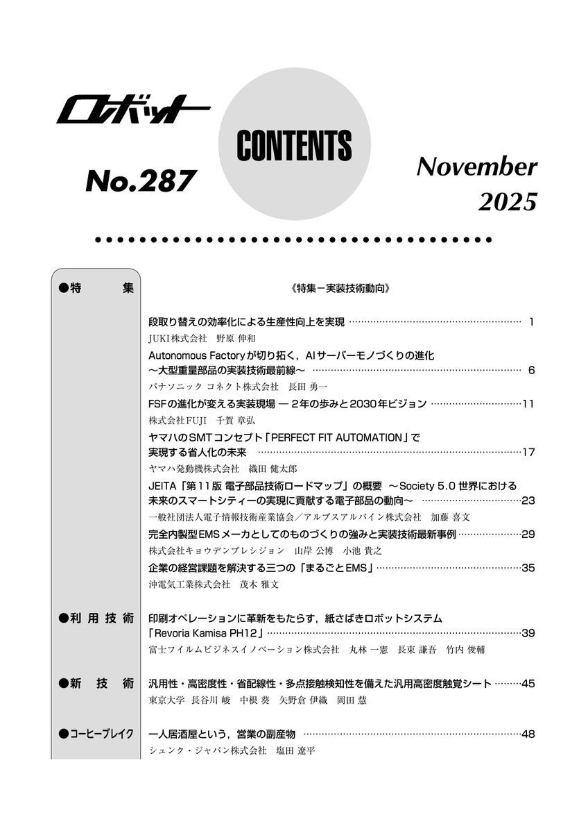 11月21日に日本ロボット工業会 #JARA が機関誌『ロボット』287号を発行。特集は「実装技術動向」。案内は buff.ly/eUXQWvB に、目次は buff.ly/wYSfTUd に。 #Robots #CircuitAssembly #Trends pic.x.com/8qCnFFVmf6
