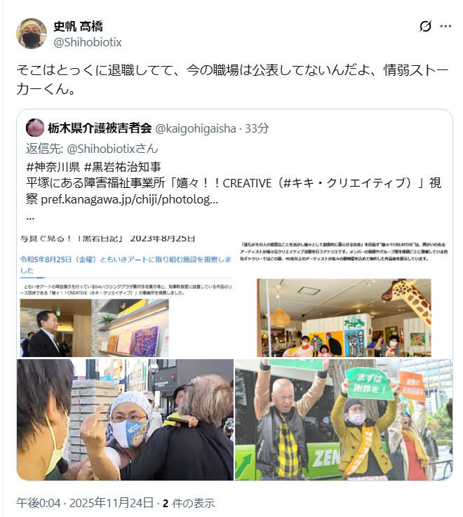 返信先:@Shihobiotix#神奈川県 #黒岩祐治知事 平塚にある障害福祉事業所「嬉々!!CREATIVE(#キキ・クリエイティブ)」視察 pref.kanagawa.jp/chiji/photolog… 運営 #ジョイン・クリエイティブマネジメント 社長 #北澤桃子 #武田桃子 #日本共産党 #しばき隊 #中指おっ立て隊 #高橋史帆 #JCPサポーター #ケースワーカー pic.x.com/3Vf5L30eTF