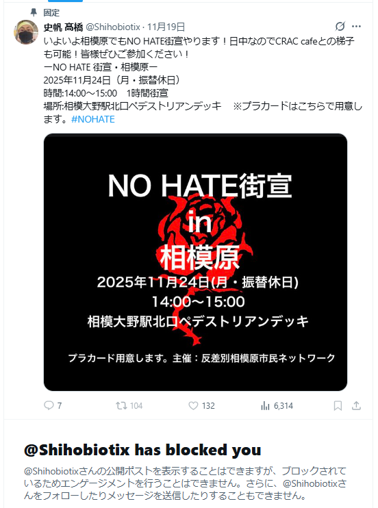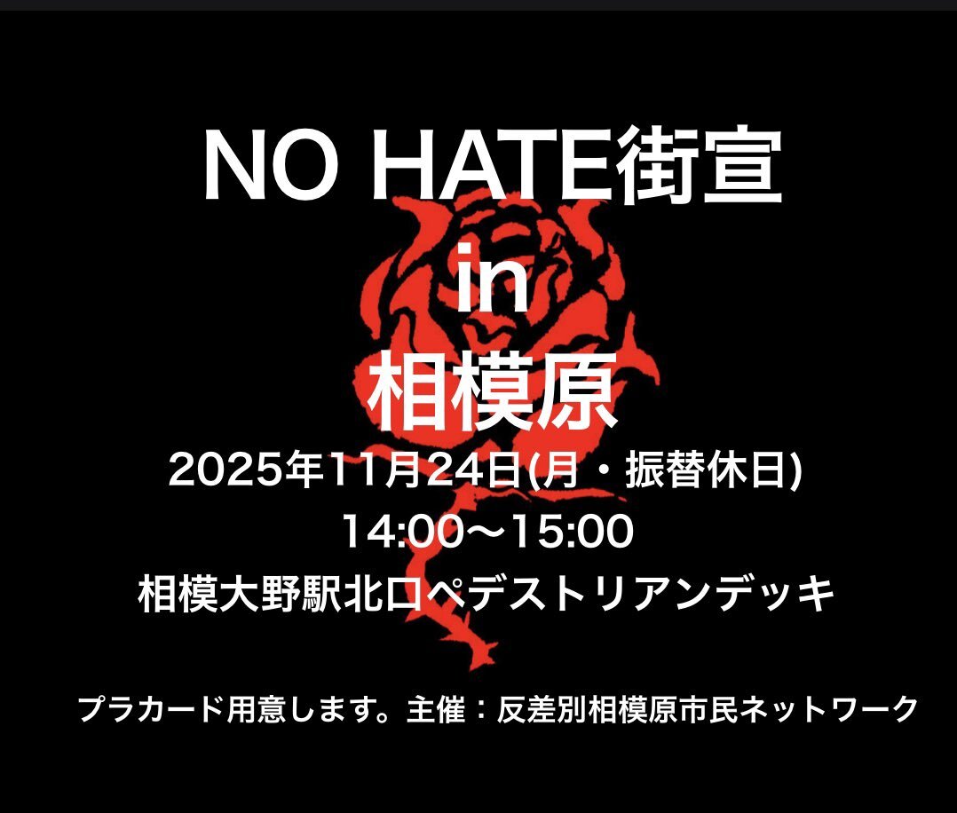 いよいよ相模原でもNO HATE街宣やります!日中なのでCRAC cafeとの梯子も可能!皆様ぜひご参加ください! ーNO HATE 街宣・相模原ー 2025年11月24日(月・振替休日) 時間:14:00~15:00 1時間街宣 場所:相模大野駅北口ペデストリアンデッキ ※プラカードはこちらで用意します。#NOHATE