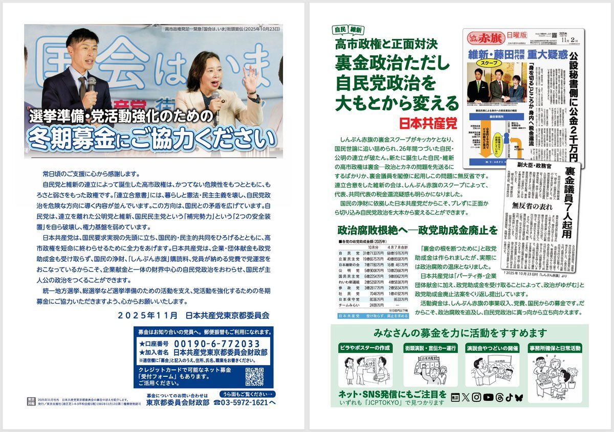 #日本共産党 東京都委員会のビラ(東京民報 号外)が発行されました。 ●高市政権の総合経済対策・補正予算案 暮らし守る柱なし jcp-tokyo.net/2025/1128/1146… ●台湾有事─危機取り除く外交努力を jcp-tokyo.net/2025/1113/1141… ●冬期募金にご協力ください jcp-tokyo.net/2025/1112/1141… #JCPサポーター pic.x.com/mnFVpJlfF7