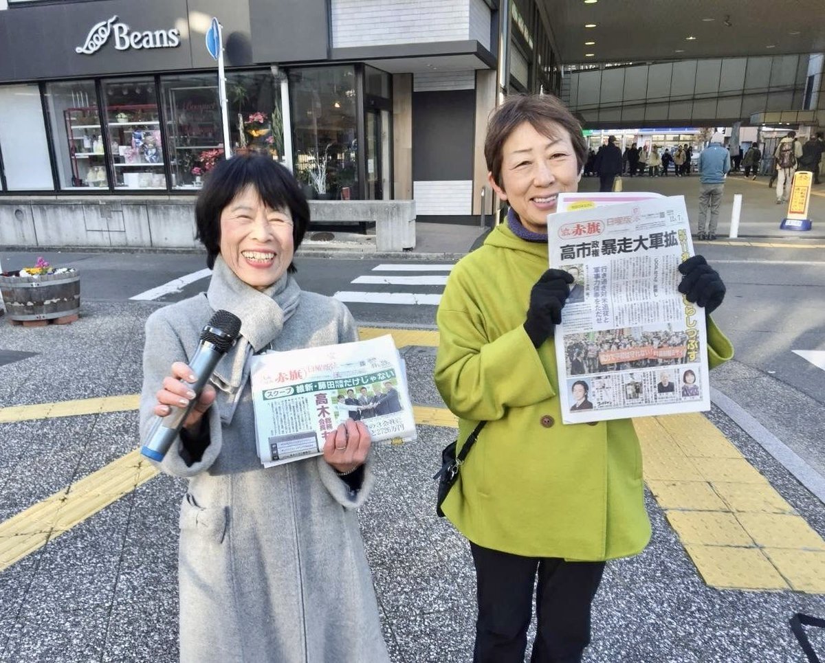 寒い朝だけど、元気に笑って「高市政権」を切る! 武蔵中原駅前で #君嶋ちか子 元県議、 #大庭裕子 元市議が「高市政権の暴走、大軍拡の危険性を訴えていた #JCPサポーター pic.x.com/fek6PRvnox
