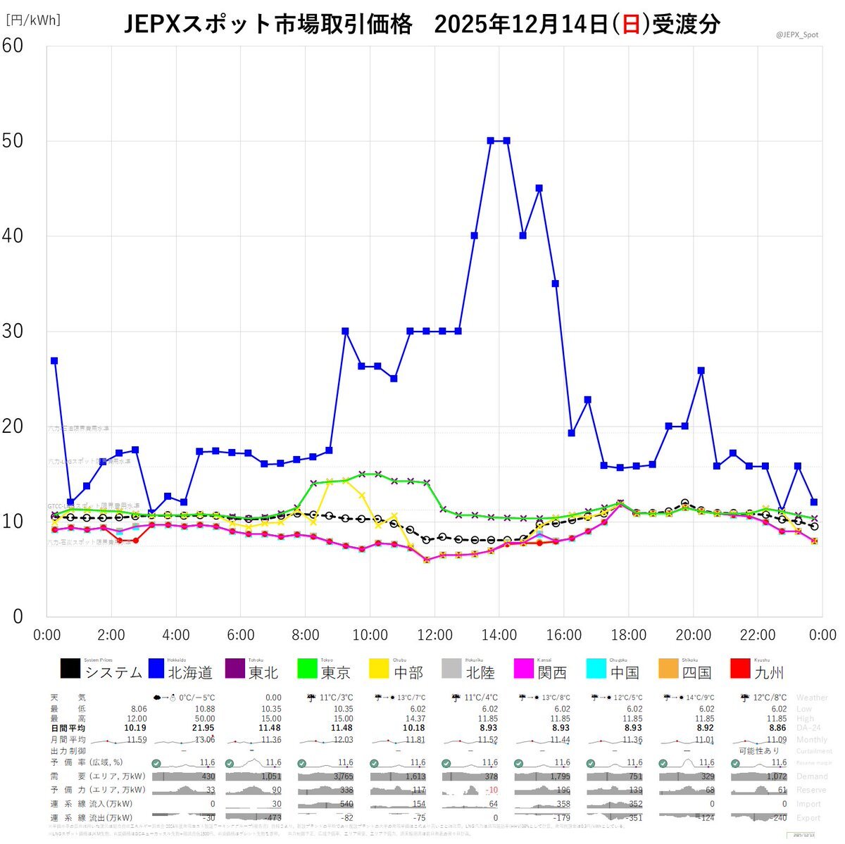 JEPXスポット市場2025年12月14日(日)受渡分取引価格☞システムプライス平均値📊10.19円/kWh、最高値📈12円/kWh、最低値📉8.06円/kWh、東京BL🏙11.48円/kWh、関西BL⛩8.93円/kWh、取引量⚡710GWh<天気予報>札幌🌨0℃/ー5℃、東京☔11℃/3℃、大阪🌧13℃/8℃、福岡☔12℃/8℃
