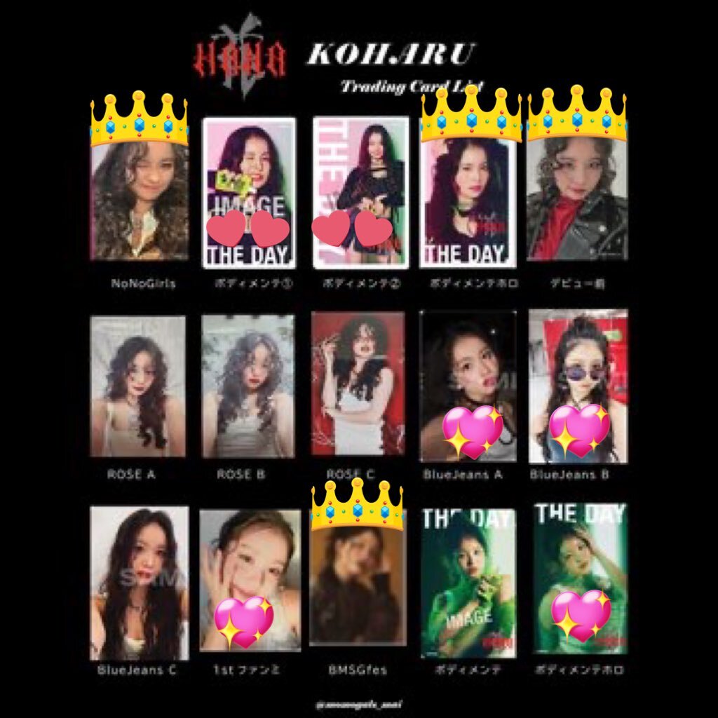 💛HANA トレカ交換💛 譲 画像一枚目(CHIKA NAOKO JISOO YURI MAHINA) 求 全KOHARU 優先度(👑→💖→💕→スタンプ無し) 詳しくは1枚目ALTご覧ください🙇🏻‍♀️՞ #HANA #トレカ交換 #CHIKA #NAOKO #JISOO #YURI #MOMOKA #KOHARU #MAHINA #BMSG #NoNoGirls #ホログラム pic.x.com/nK6SBp27Zj