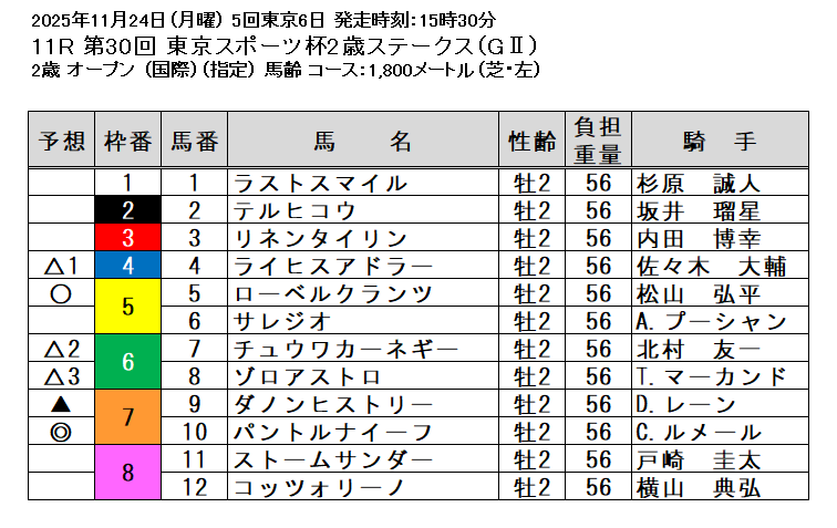 【結果】11/24 東京11R 東京スポーツ杯2歳ステークス 芝1800m1着パントルナイーフ/2着ゾロアストロ/3着ライヒスアドラー/ 払戻情報 winkeiba.jp/race/results?D… #keiba #jra