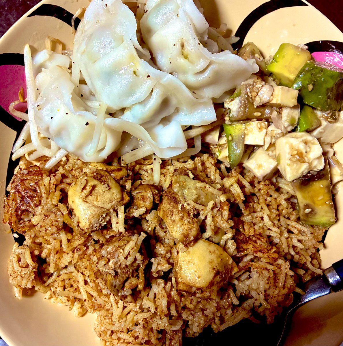 実は週末に #ビリヤニ 作った。 #KALDI さんだけど。 しかも、水50mlを信用できず炊飯器の2のメモリまで水入れたけど😝 硬さは丁度よかったんだけど、やっぱ味は薄めになったかしらね。 いや、茶色いだろっ! 自分で言っとく。 ヨーグルトなかったからアボカドと豆腐のなんちゃら。と、餃子🤭 pic.x.com/GFhYRAgeYG