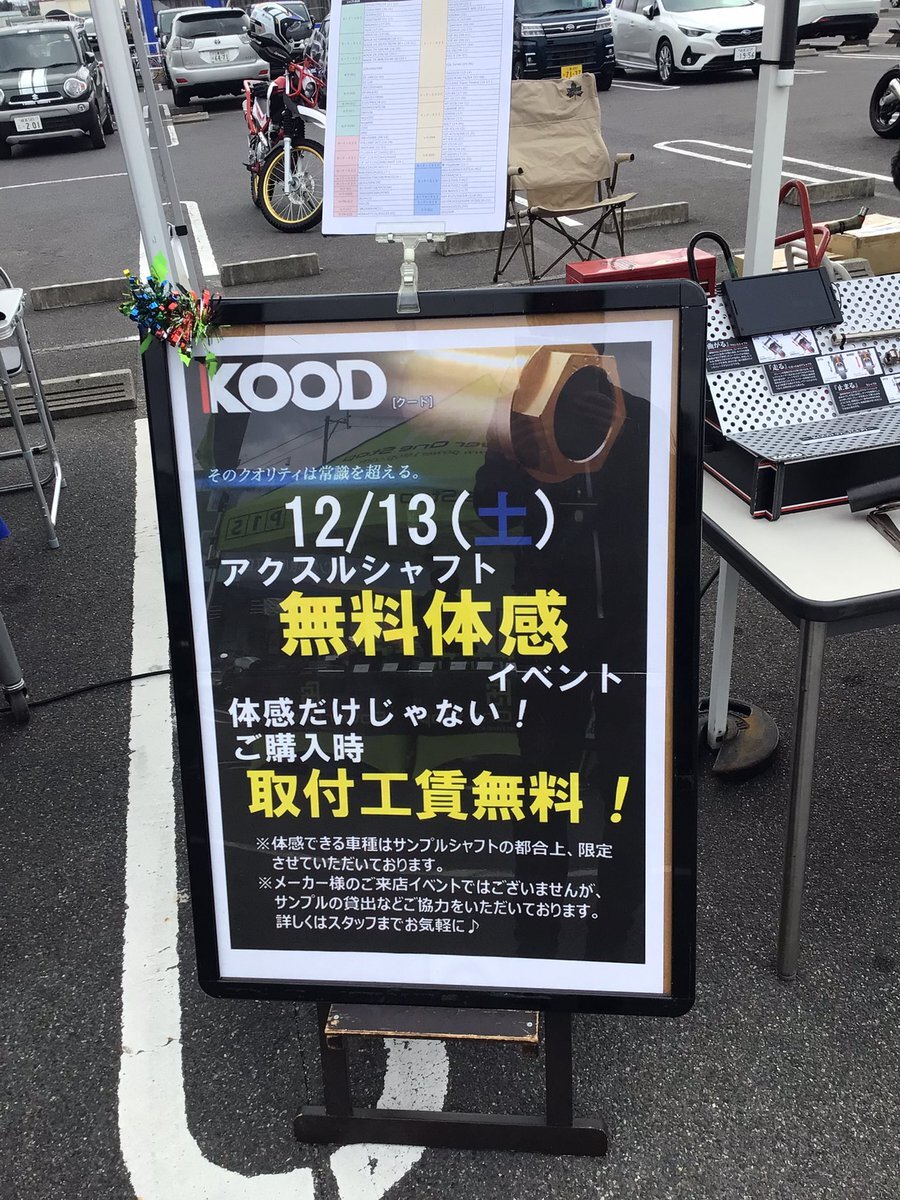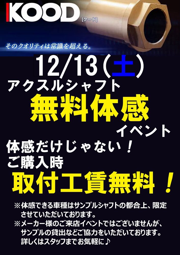 12/13(土)イベント情報 #KOOD アクスルシャフト無料体感イベント開催 愛車にKOOD製フロントシャフト(体感用)を取付 実際に試走&体感できます❗️ 当日KOOD製フロントシャフトご購入で無料取付🛠️ 予約制のイベントになります お早めにご予約、お問い合わせください😉 pic.x.com/JAUr53qaKu