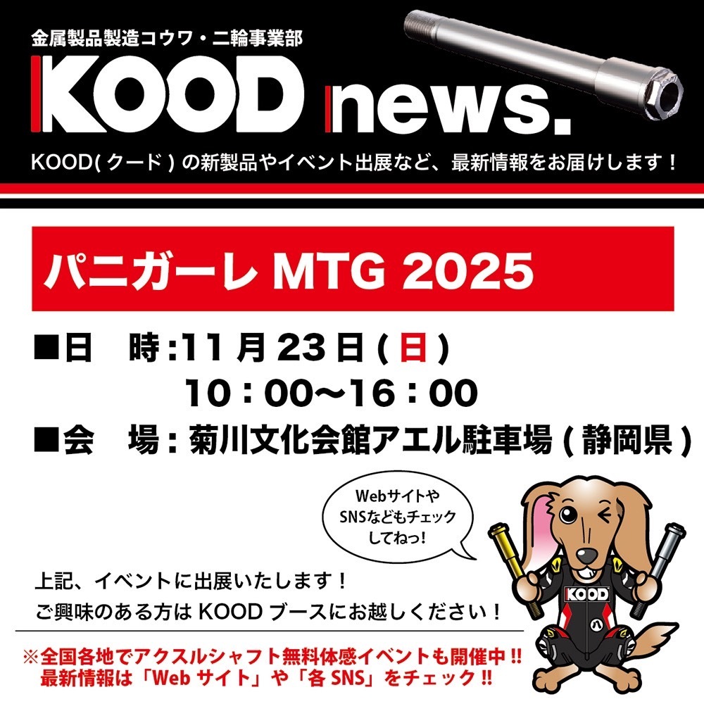 こんにちは😃 イベント出展のご案内をさせていただきますので皆様よろしくお願いいたします🙇 #KOOD #クロモリアクスルシャフト #カワサキプラザ #バイクワールド #ナップス #パニガーレ pic.x.com/UblhCQ8zAp