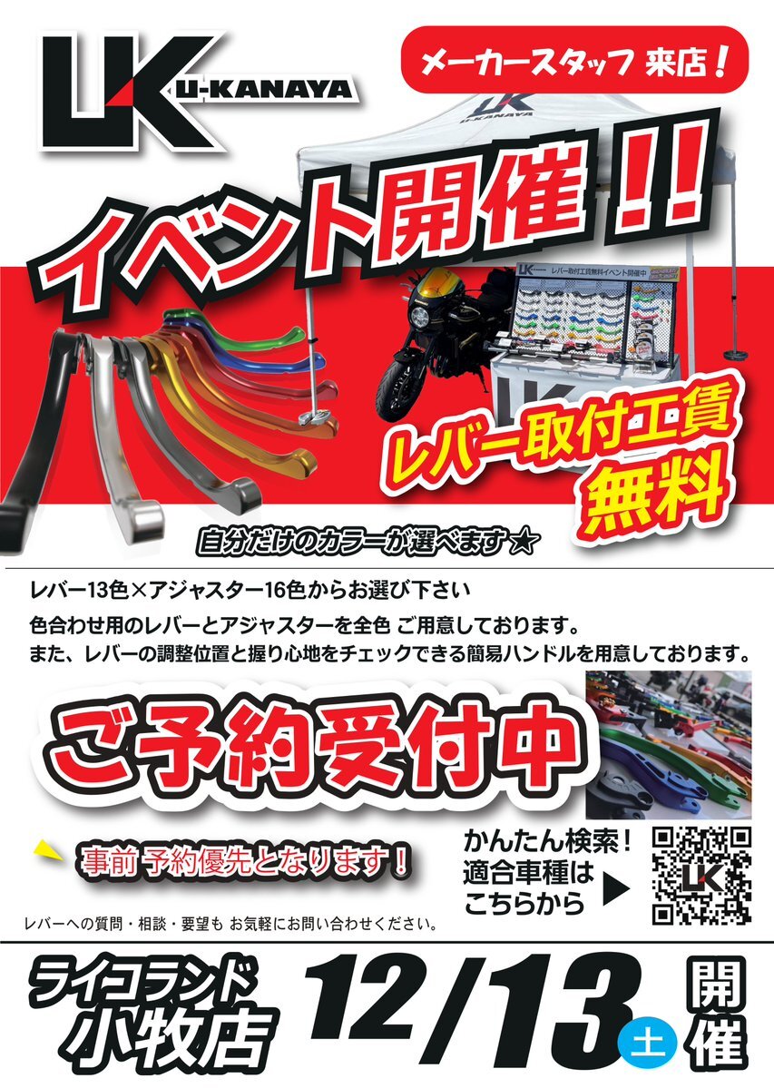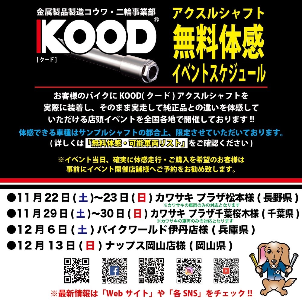 12/13イベント情報🏍️ #ユーカナヤ 工賃無料取り付けイベント #KOOD アクスルシャフト無料体感イベント ご予約優先イベントとなります まだ枠に空きがございます❗️ ご検討中の方は是非ご予約、お問い合わせください😉 pic.x.com/pjXz2XEmc6
