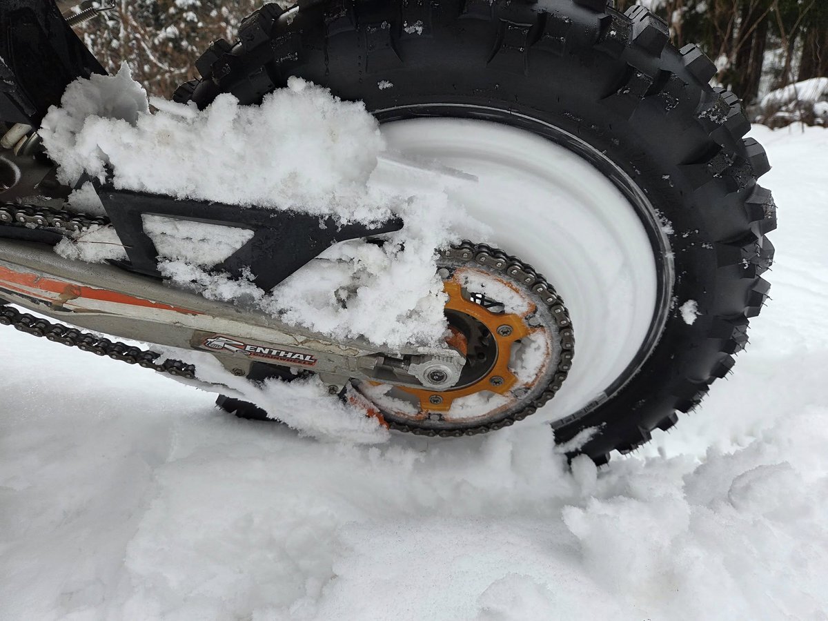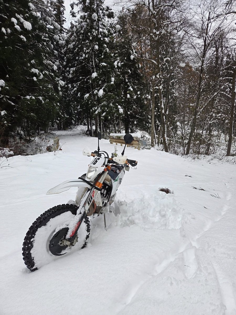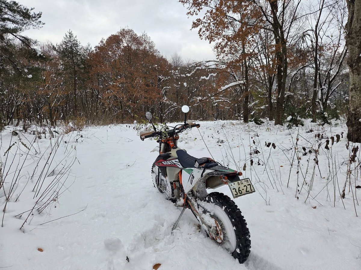 終わりの始まりですが、 やっぱりバイクは楽しい🎵 舗装路では、ずっとウネウネします😆 スローな状況でも スタンディングでこなすと、 体幹が鍛えられます😄 ダートになると、 降りたてならグリップしてくれますよ⛄ #雪 #450EXCFSIXDAYS #KTM pic.x.com/NlXOA4Xwkm