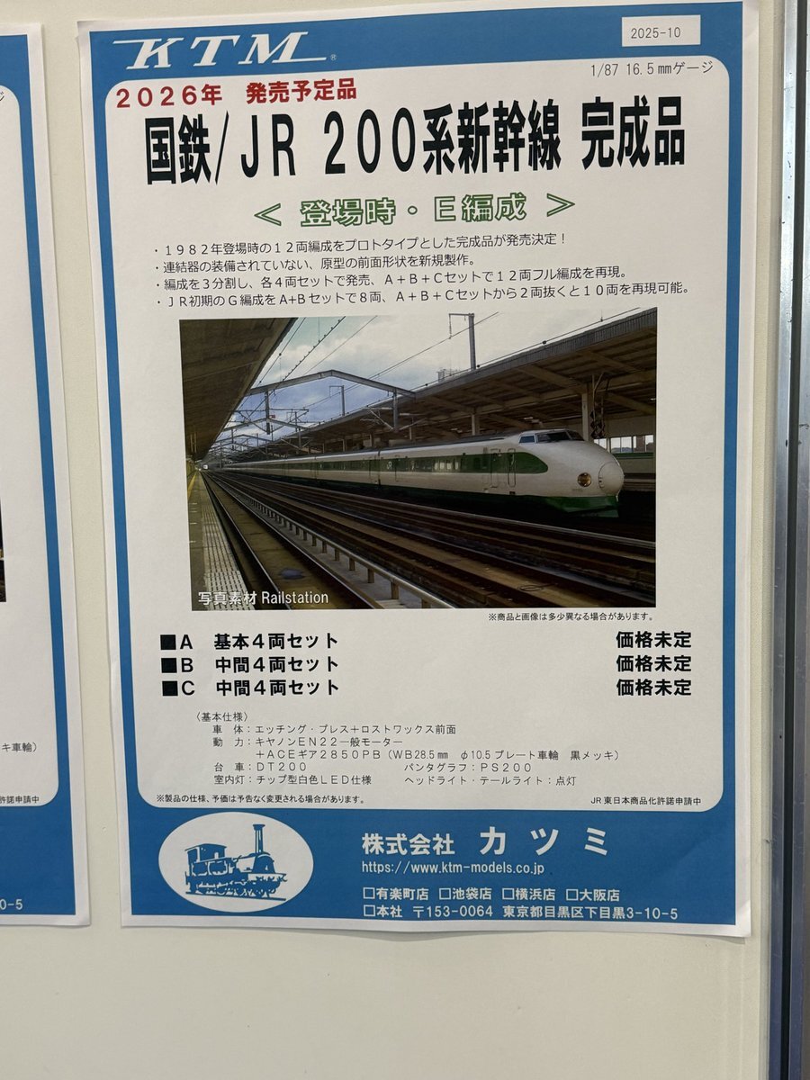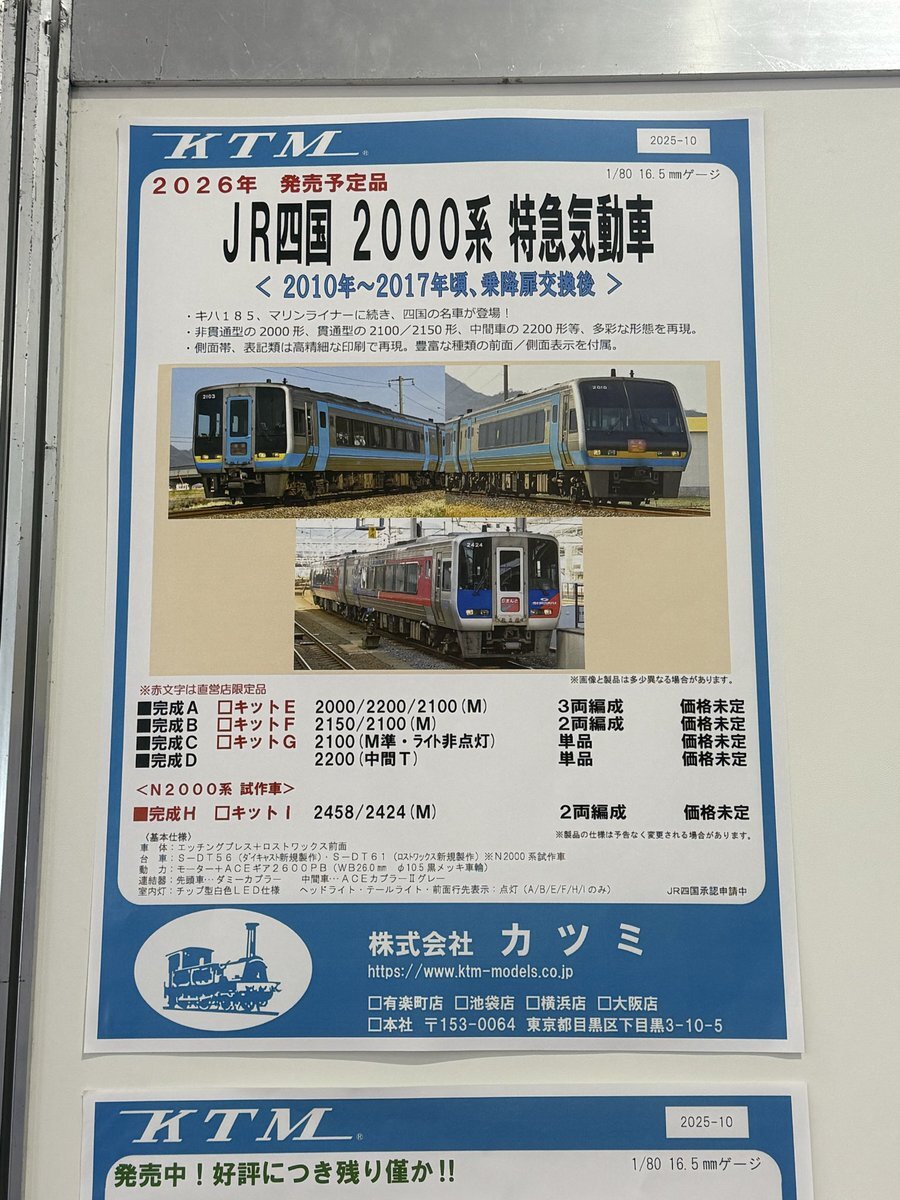 全日本模型ホビーショー2025展示 カツミの予定品ポスターです。 ✨東武8000系完成品・キット ✨国鉄/JR 200系新幹線 完成品 ✨JR四国 2000系特急気動車 などが掲示されています。 #KTM #カツミ #16番 #鉄道模型 #全日本模型ホビーショー pic.x.com/hxGCsZhLEq