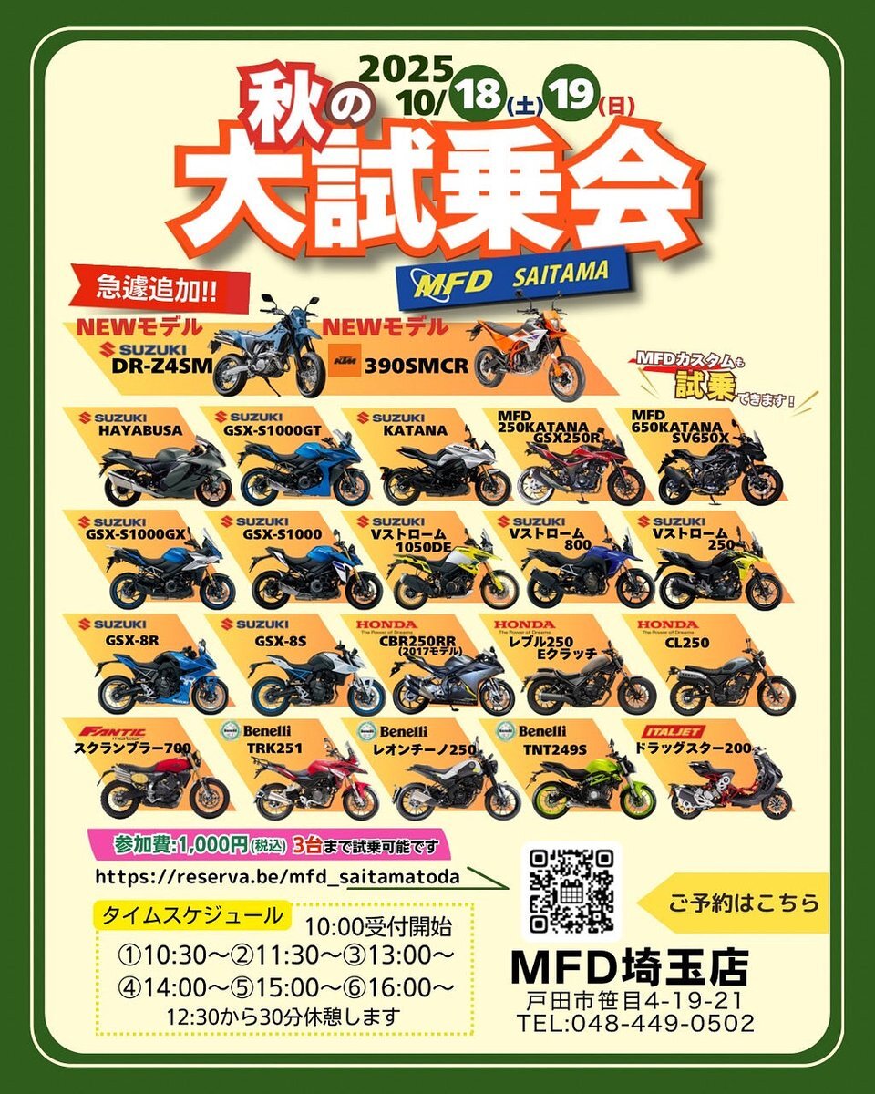いよいよ今週末‼️10/18(土)19(日)は 秋の大試乗会です🍁 KTM390CMCRも急遽追加しました‼️ 合計22台の大試乗会!! お一人1,000円で3台まで試乗できます!✨ これは乗るっきゃないっしょ〜! たくさんのご参加お待ちしています✨ ご予約はこちら💁‍♀️ reserva.be/mfd_saitamatoda