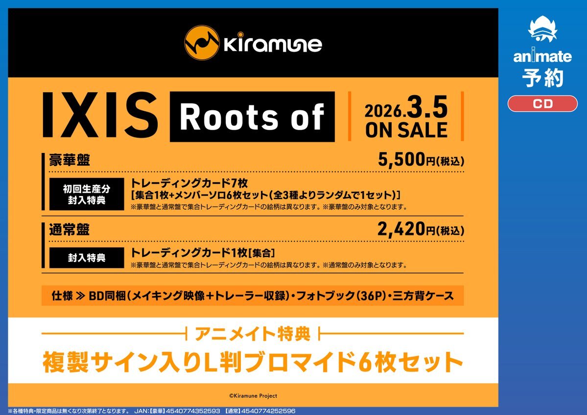 【CD予約情報】 2026/3/5発売 『IXIS/Roots of』ご予約受付中‼️ 🎁アニメイト特典 🔹複製サイン入りL判ブロマイド6枚セット #IXIS #Kiramune 通販はこちら🔻 animate-onlineshop.jp/pd/3356022/?ut… pic.x.com/HrjJgJ1mfP