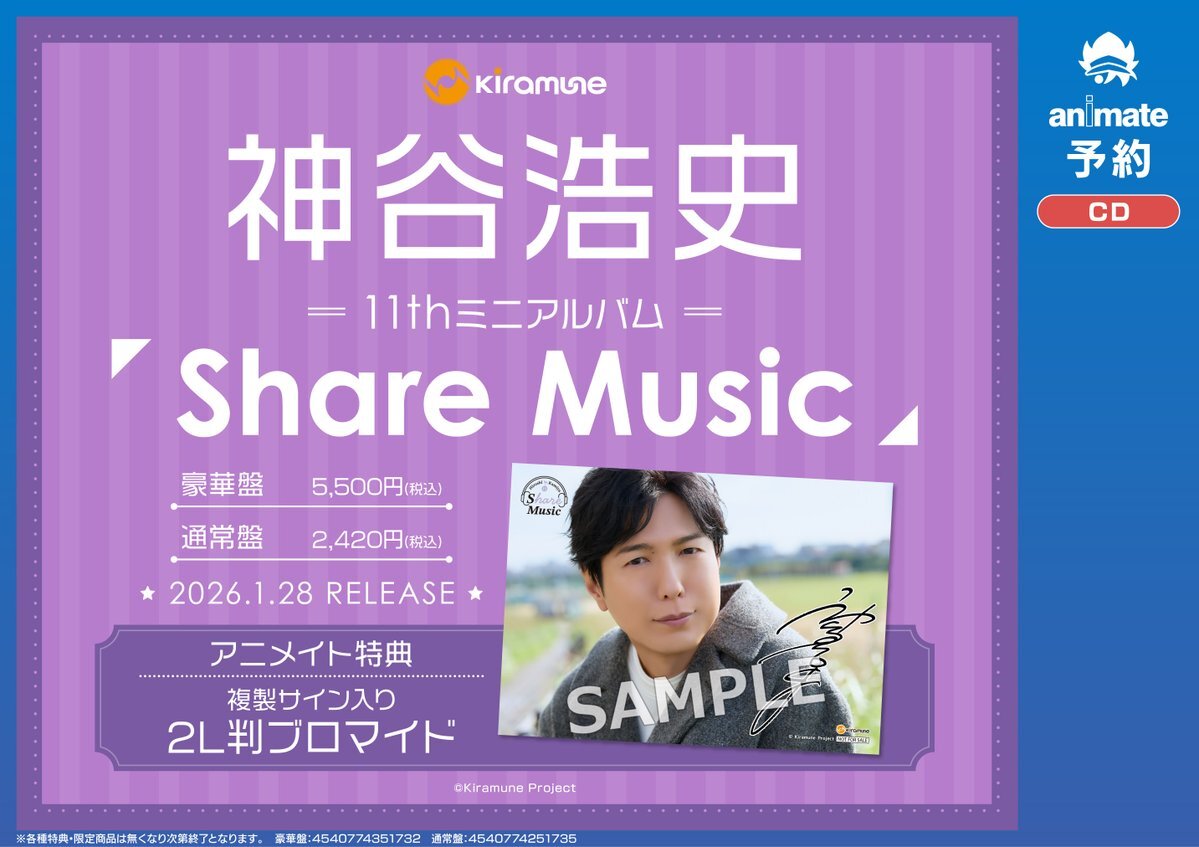 【CD予約情報】 2026/1/28 発売 『#神谷浩史 11thミニアルバム「Share Music」』 ご予約受付中‼ ✅「発売記念イベント」シリアル配布中(~2026/1/13) ⚠️商品形態によってご応募いただけるイベントが異なります #Kiramune 🔻バーコード簡単予約はこちら🔻 animate-onlineshop.jp/pd/3301559/?ut… pic.x.com/yvWiVcptlu