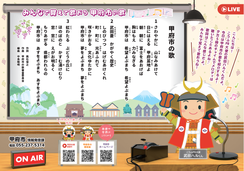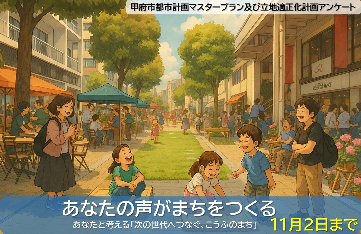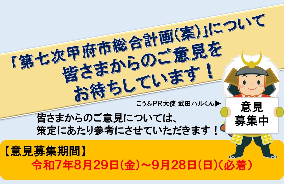 ─❖甲府市からのお知らせです❖──── 「第七次甲府市総合計画(案)」の意見募集 ─────────────────── 総合的かつ計画的に市政運営を進めるための指針として、本計画(案)がまとまりました!!皆さまからのご意見を募集します🙇‍♀️ 詳しくはコチラ👇 city.kofu.yamanashi.jp/sogokeikaku/sg…