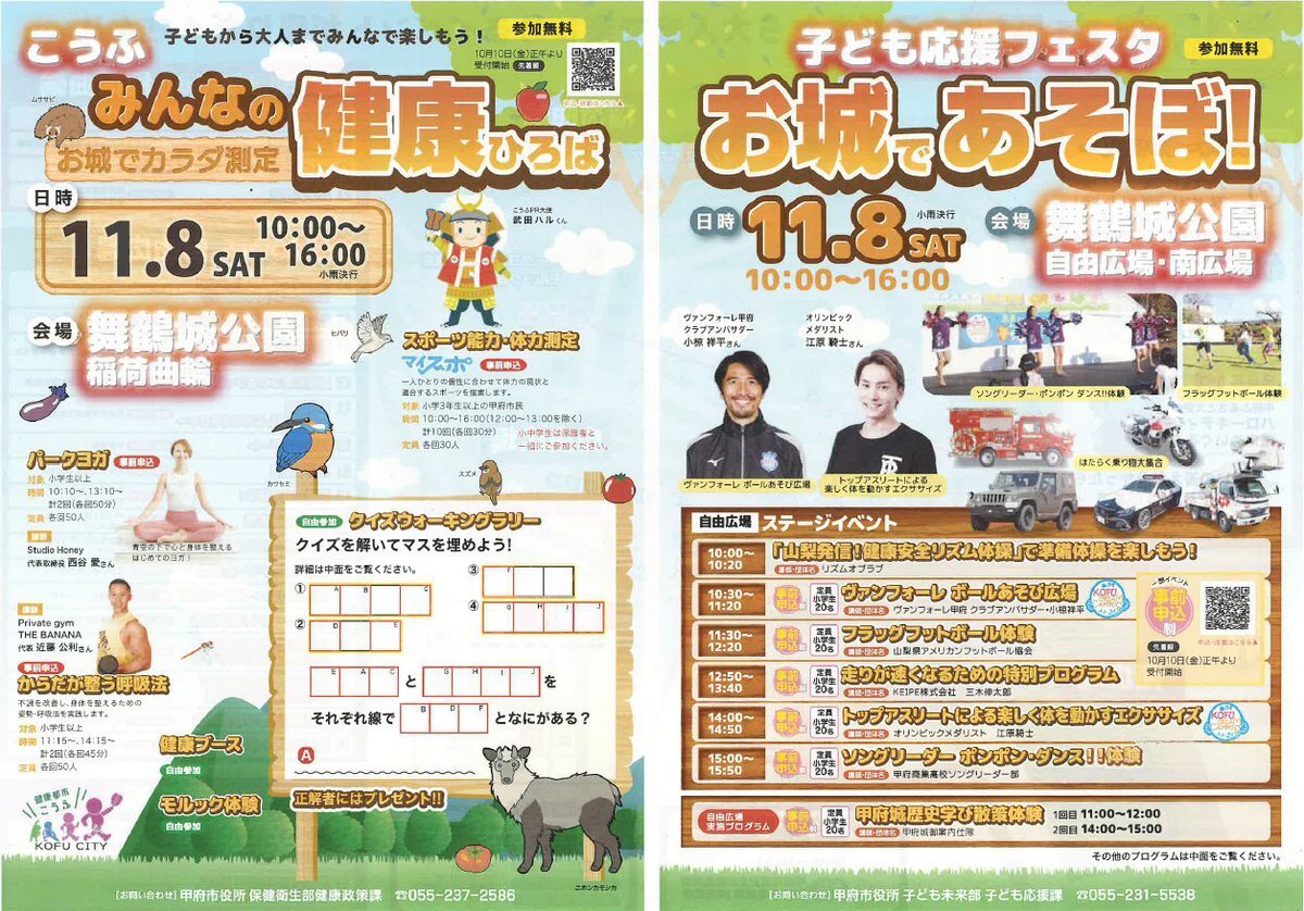 ⭐子ども応援フェスタ お城であそぼ! ⭐こうふみんなの健康ひろば 11/8(土)10:00~16:00 舞鶴城公園でみんなで楽しくあそびましょう♪ 事前予約が必要なものもあるので、市HPを確認してくださいね。当日参加でももちろん楽しめます! city.kofu.yamanashi.jp/kodomoooen/kod… #甲府市 #甲府 #kofu pic.x.com/yqgwfXE7VO